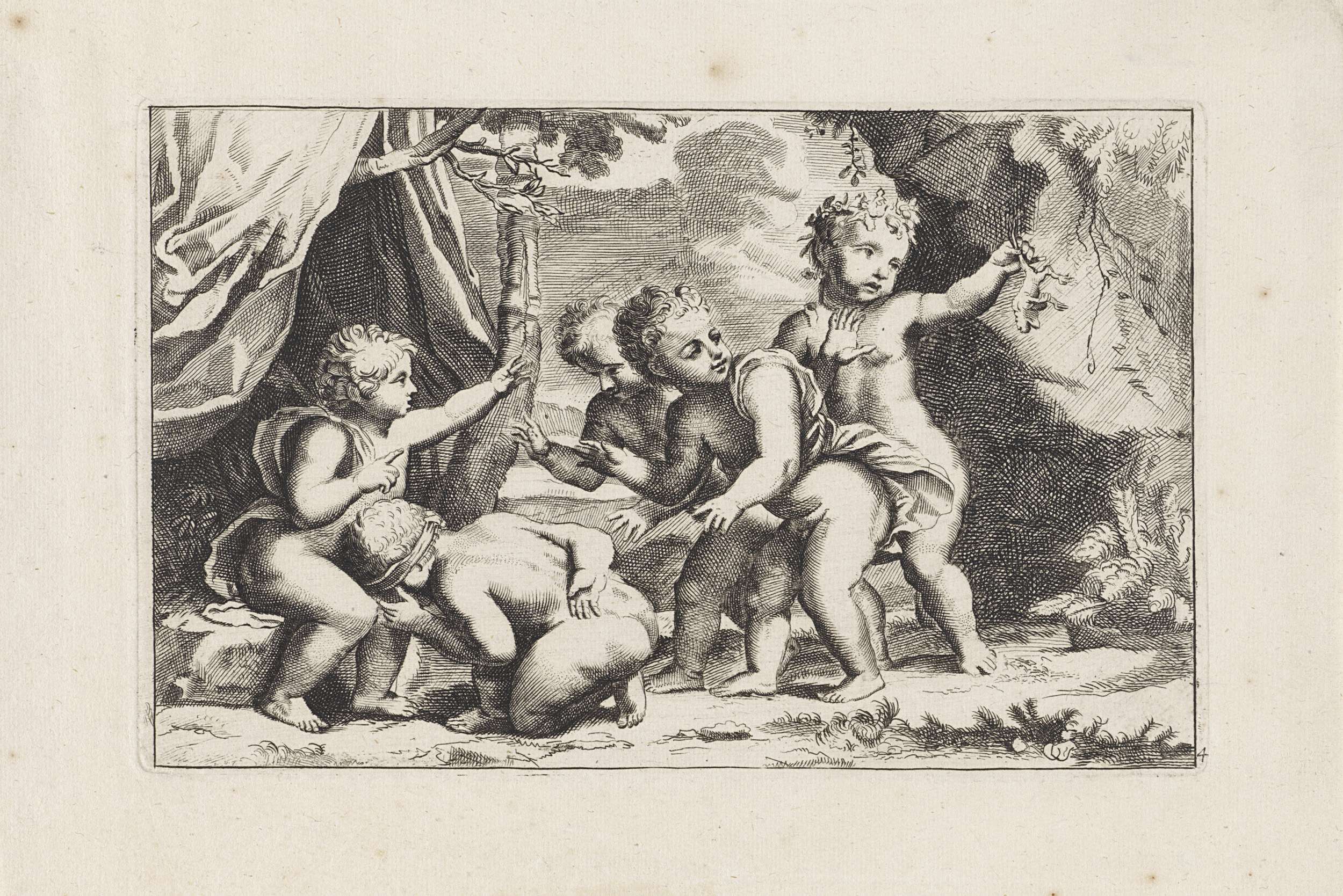 Vijf putti spelen voor een tent. Eén van hen knielt geblinddoekt voor een andere putto. De putto rechts houdt een dier aan zijn staart omhoog.