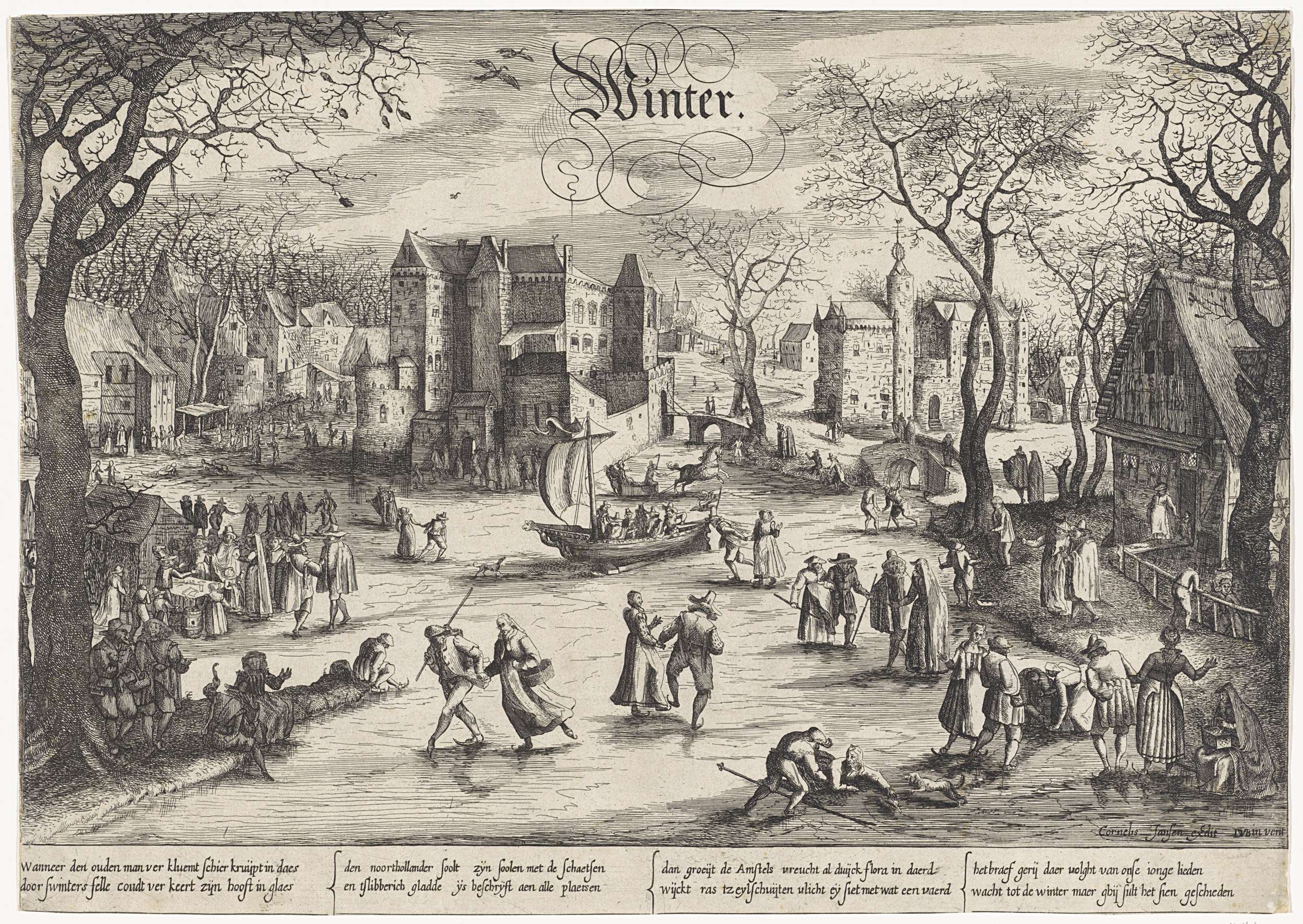Gezicht op een bevroren rivier met schaatsende en sleeënde mensen. In het midden een zeilschip voor een versterkt gebouw. Links en rechts bebouwing. Onder in de marge een achtregelig gedicht in het Nederlands.
