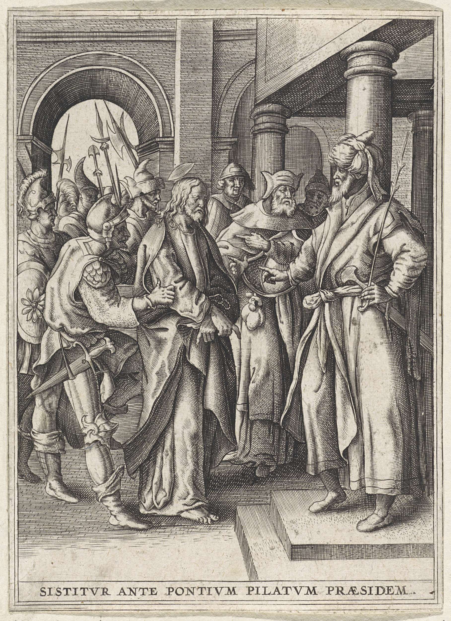 Christus staat tussen gewapende soldaten voor Pilatus. Achter Pilatus enkele joodse oudsten. Onder een éénregelige toelichting in het Latijn.