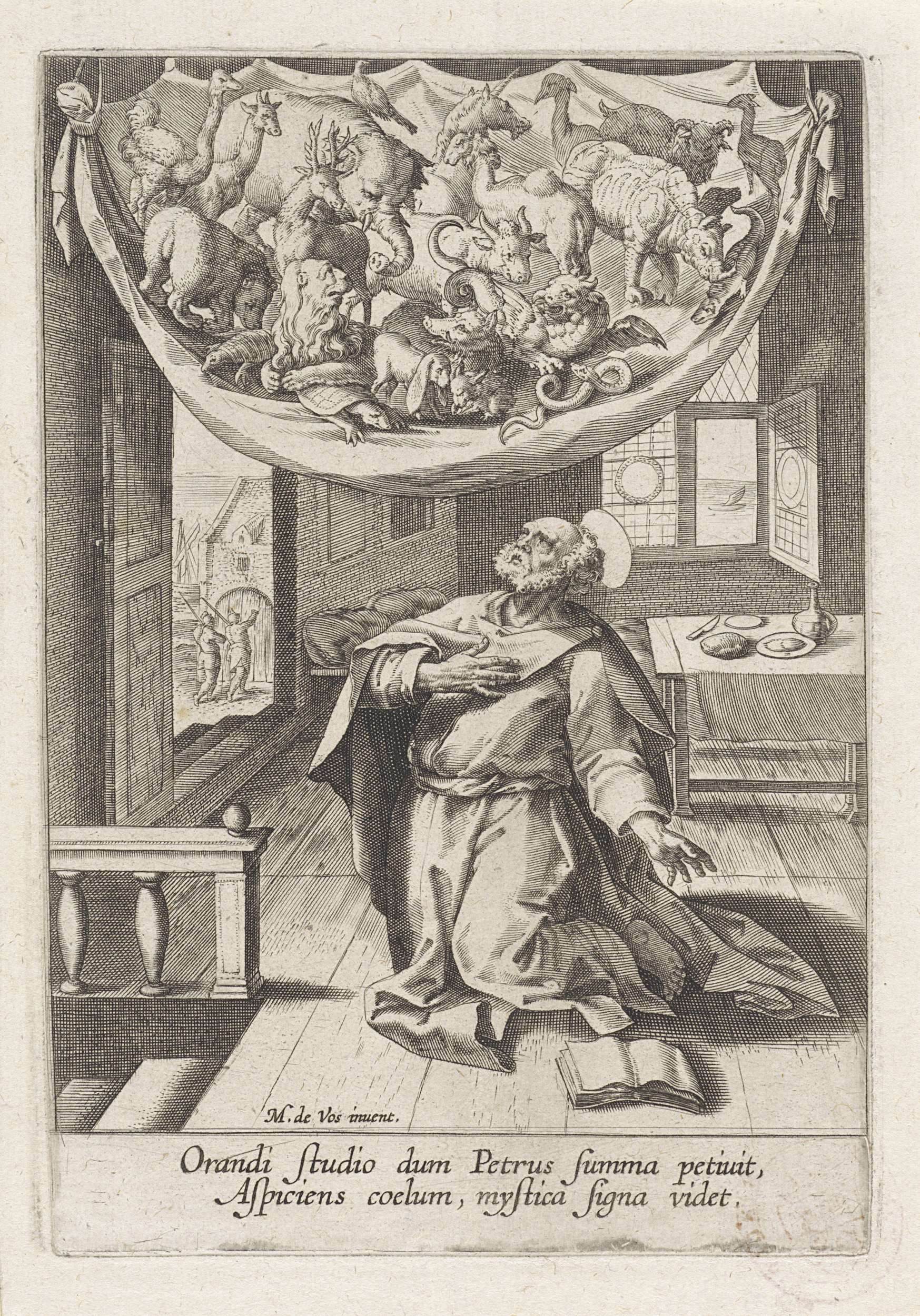 Simon bidt in het huis van Simon de leerlooier. Boven hem verschijnt een laken met allerlei onreine diersoorten. Hij kreeg drie keer het bevel om de dieren te slachten en op te eten, maar dat weigerde hij. Onder in de marge een tweeregelig onderschrift in het Latijn.