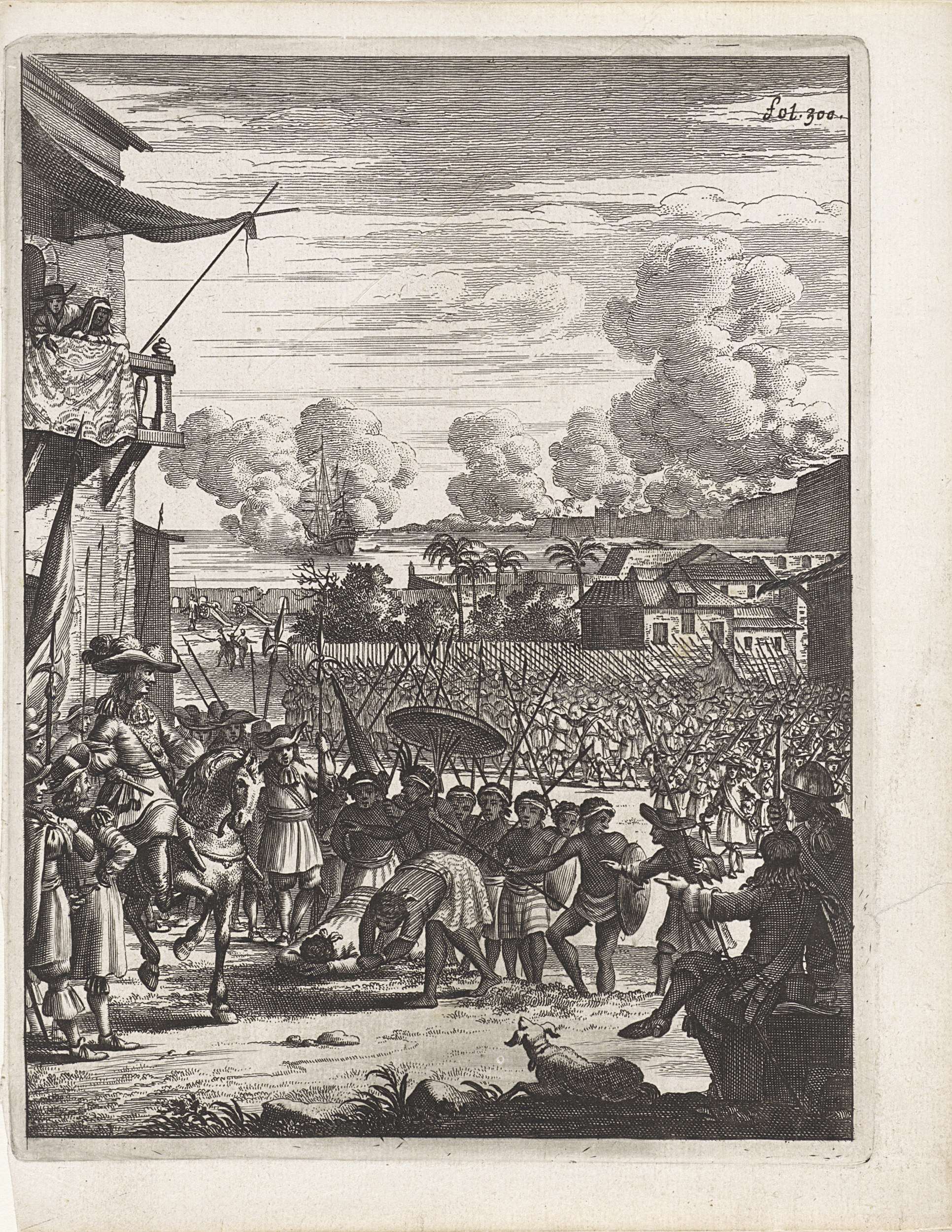 Op de voorgrond buigen twee Indiase vorsten uit de buurt van Kollam voor Rijcklof van Goens. Op de achtergrond gewapende Europese soldaten. In de verte een zeeslag. Rechtsboven: fol. 300.