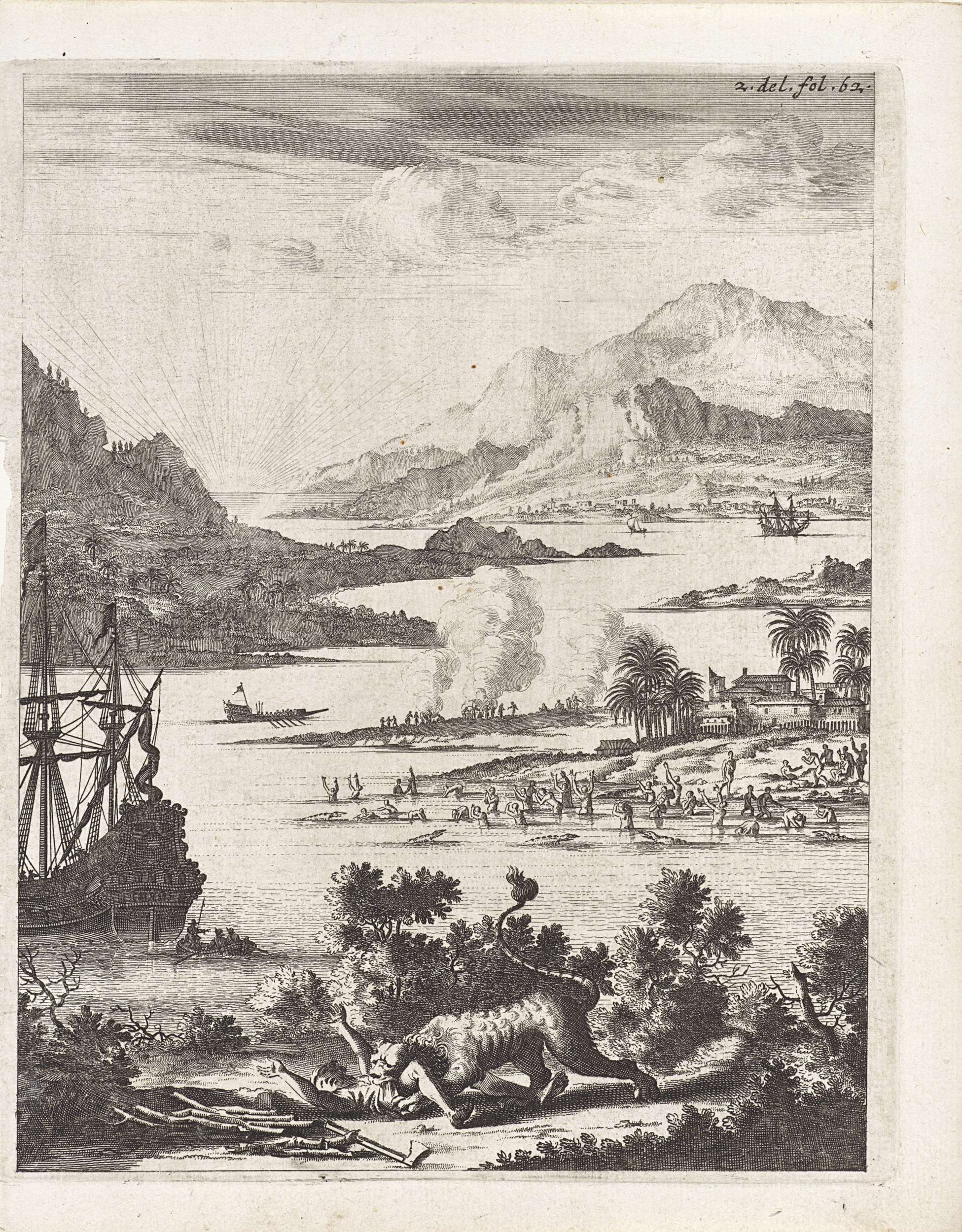 Vooraan valt een leeuw een houthakker aan. Op de achtergrond een bergachtig rivierlandschap met enkele boten. Rechts mensen in het water met hun handen in de lucht. Waarschijnlijk zijn ze bang voor de krokodillen die in hun richting zwemmen. Rechtsboven: 2. del. fol. 62.
