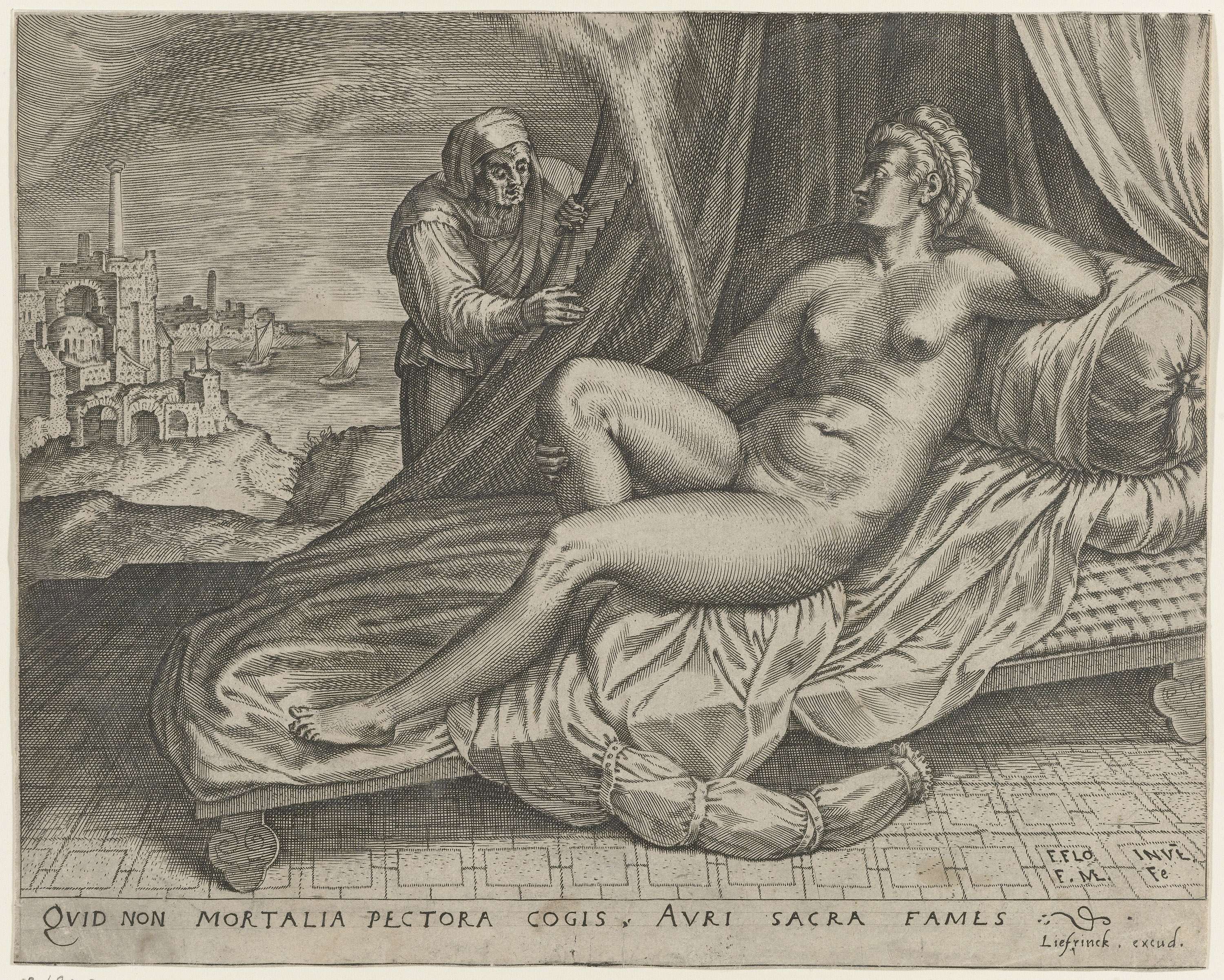 Jupiter daalt op Danaë neer in de vorm van gouden regen of licht, terwijl ze op een rustbank ligt. Haar oude dienares kijkt toe vanachter een gordijn. In de verte een gezicht op Argos. Onder in de marge een éénregelig onderschrift in het Latijn.