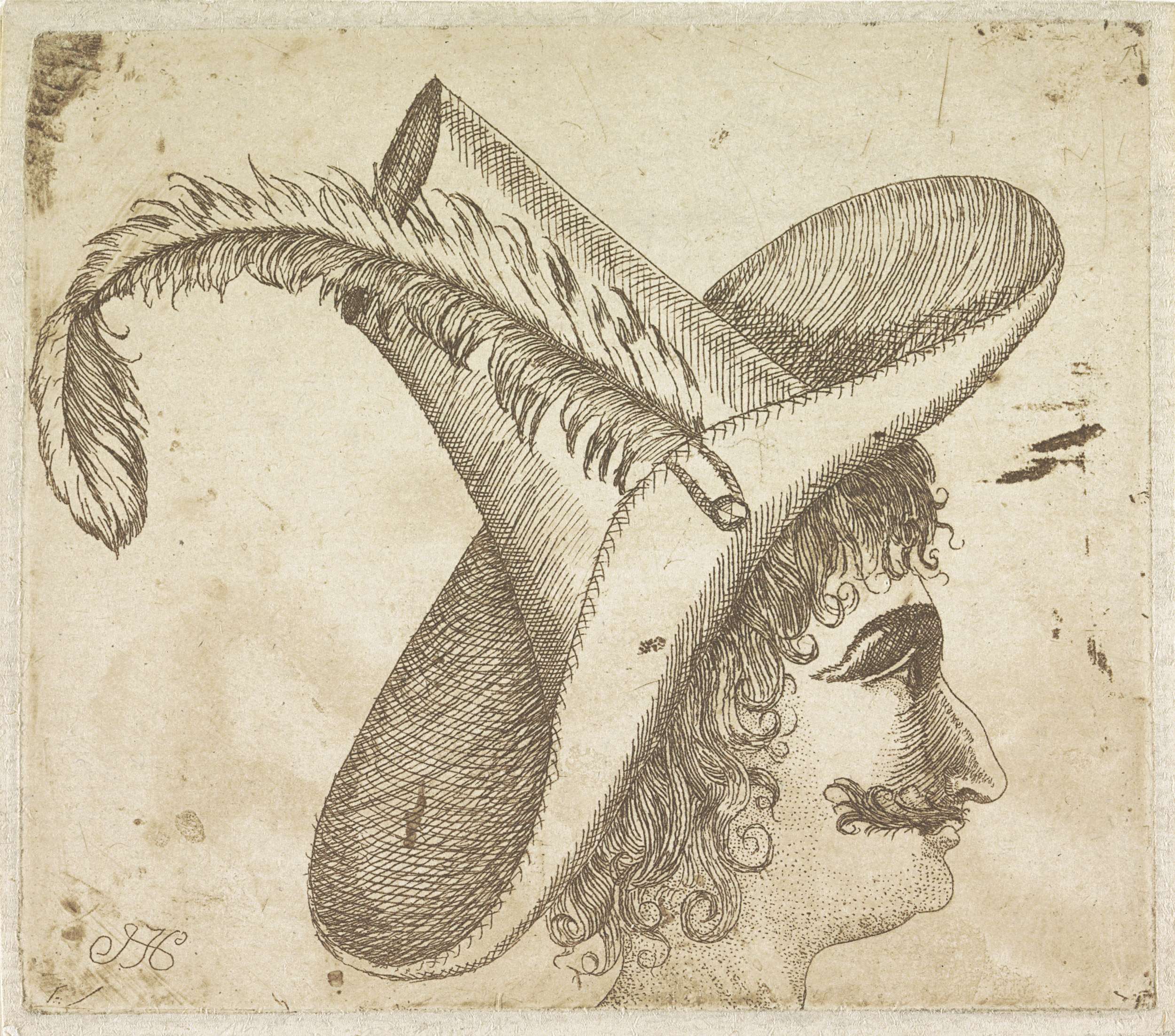 Gezicht van een man in profiel met een hoed met veer op het hoofd.