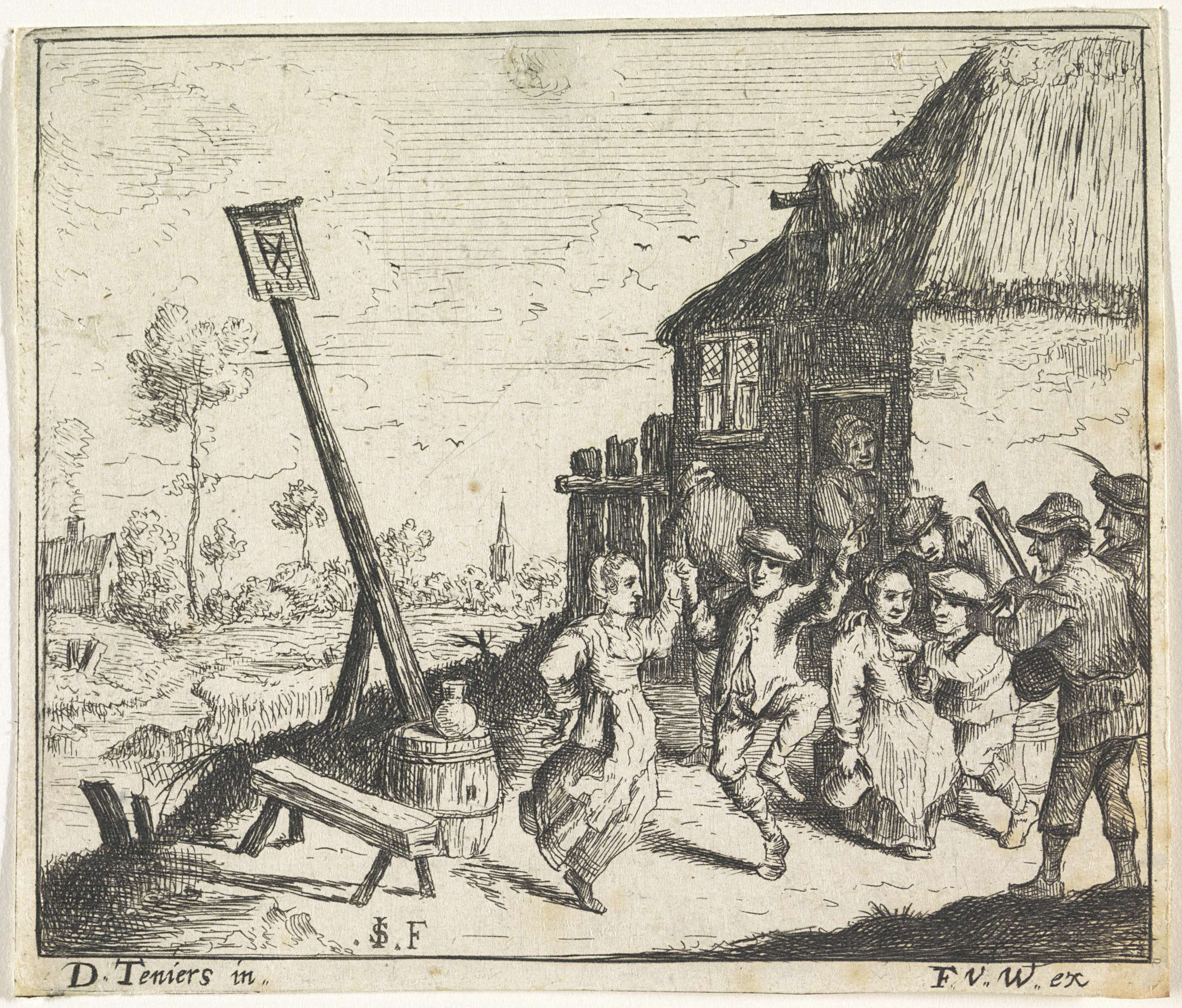 Een paar danst voor een herberg op de muziek van een doedelzakspeler. Voor de herberg zitten drinkende boeren.