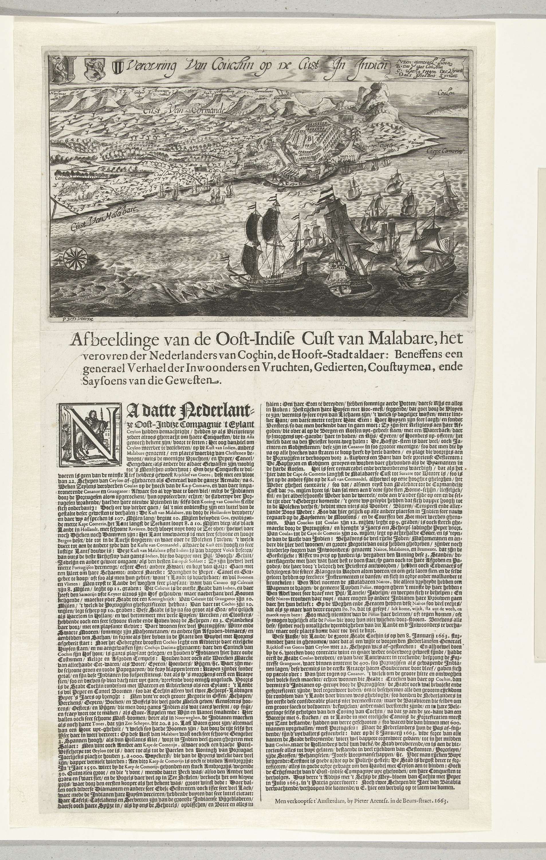 Verovering door de Hollanders van de stad Cochin op de Malabar-kust van India, 8 januari 1663. Gezicht op de kuststad met de Hollandse VOC schepen voor de kust. Bovenaan een banderol met de titel, enkele wapens en de legenda A-D. Onder de prent is een tekstblad geplakt met een beschrijving in 2 kolommen.