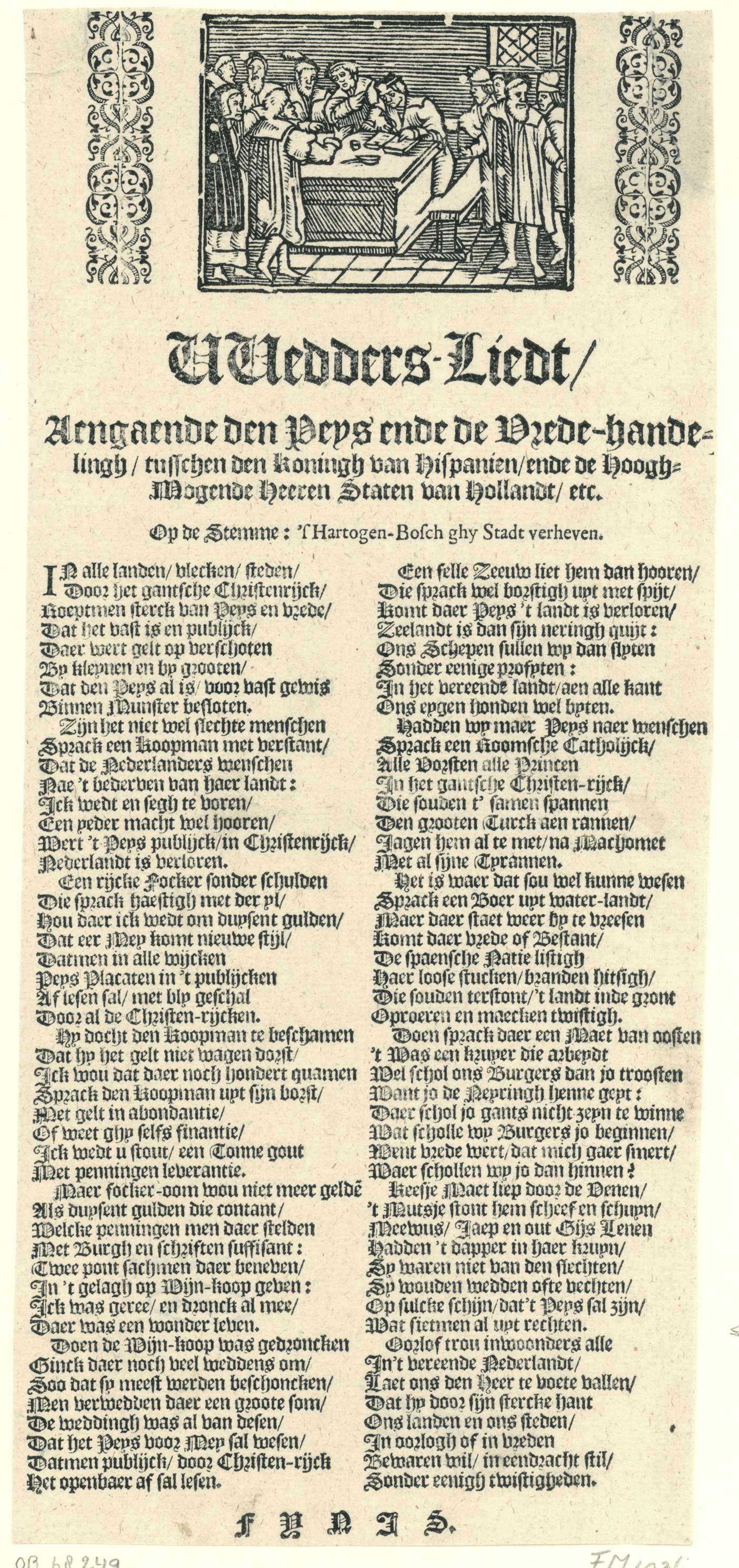 Lied over de vredesonderhandelingen met Spanje, 1647. Blad met een houtsnede en daaronder de tekst van een lied in twee kolommen in het Nederlands. Het lied heeft als onderwerp de vredesonderhandelingen te Münster. De houtsnede zelf is van een ouder datum.