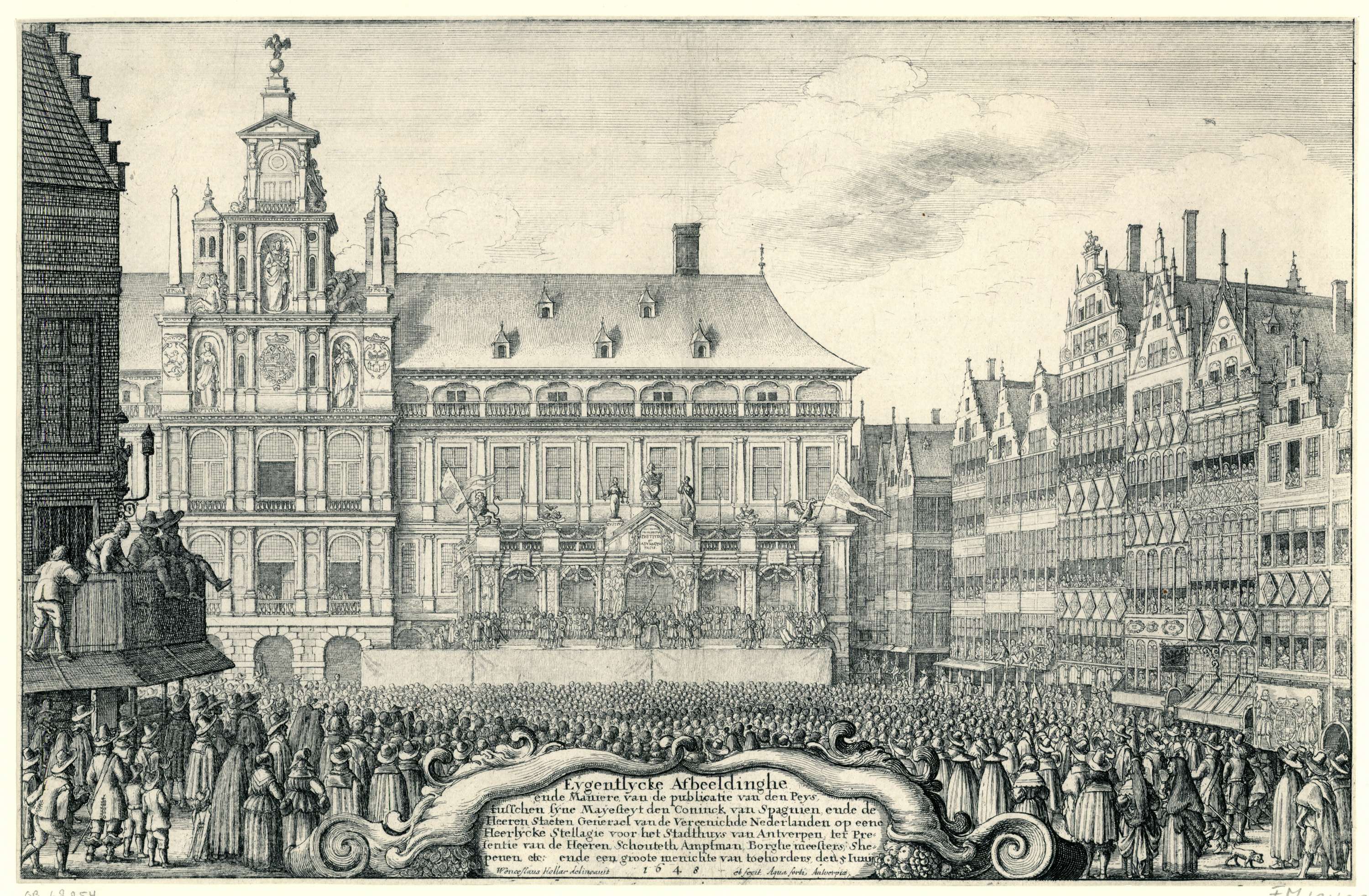 Afkondiging van de Vrede van Munster te Antwerpen op 5 juni 1648. Gezicht op de mensenmassa voor het stadhuis te Antwerpen. Midden onder een cartouche met de tekst geflankeerd door twee hoornen van overvloed.