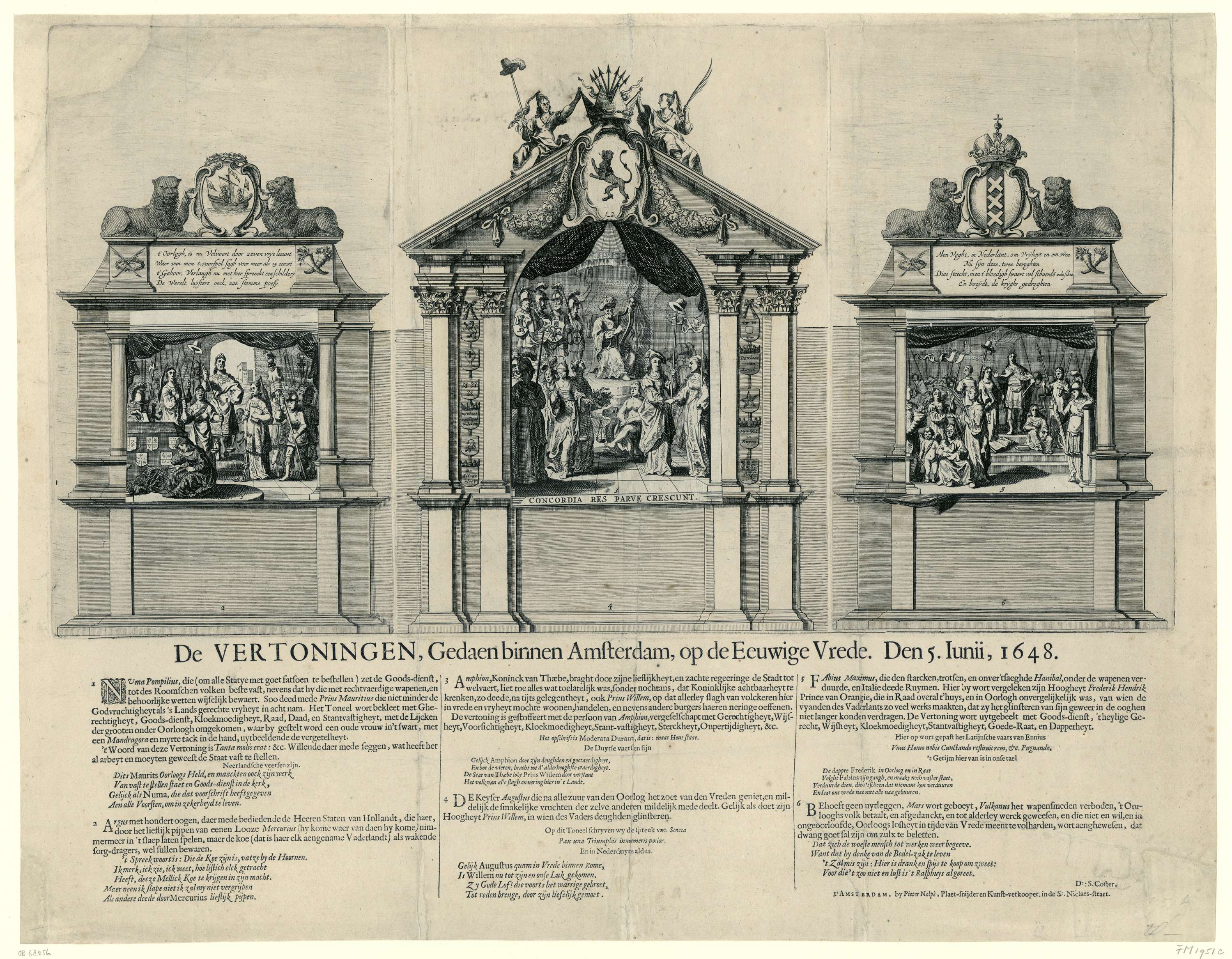 Blad met het toneel met drie van de zes zinnebeeldige vertoningen die op de Dam zijn opgevoerd ter ere van de Vrede van Munster op 5 juni 1648. Op dit exemplaar zijn alle zes tableaux te zien, met de flappen waaronder de andere drie scènes zitten. Gedrukt van drie platen met onder de voorstelling in ...