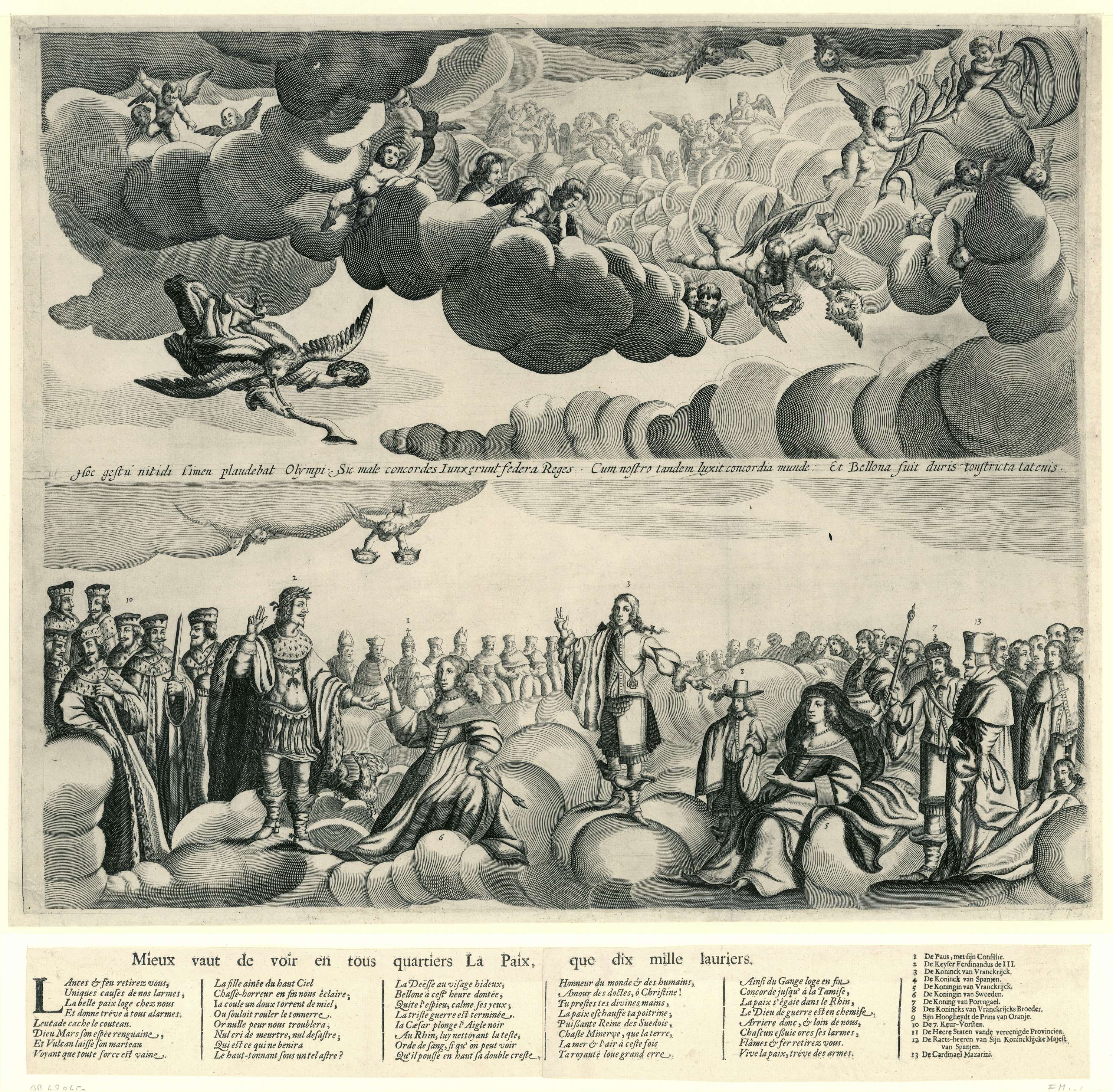 Allegorie op de Vrede van Westfalen (linkerblad), 1648. De voorstelling op het linkerblad toont boven de hemel met engelen en onder een groep vorsten in de wolken. Verschillende personen leggen een eed af. Door de wolken loopt een Latijnse tekst. Afgebeeld zijn onder andere: Lodewijk XIV, keizer Ferdinand III en koningin Christina van Zweden. Bij ...