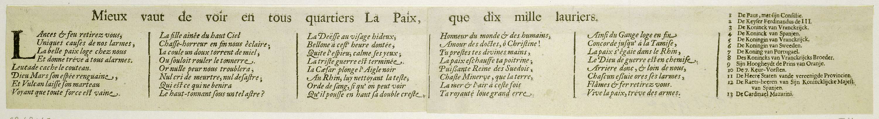 Tekstblad met Frans vers in vijf kolommen met een legenda 1-13 in het Nederlands. Behoort bij de twee bladen die samen de Allegorie op de Westfaalse vrede van 1648 vormen.