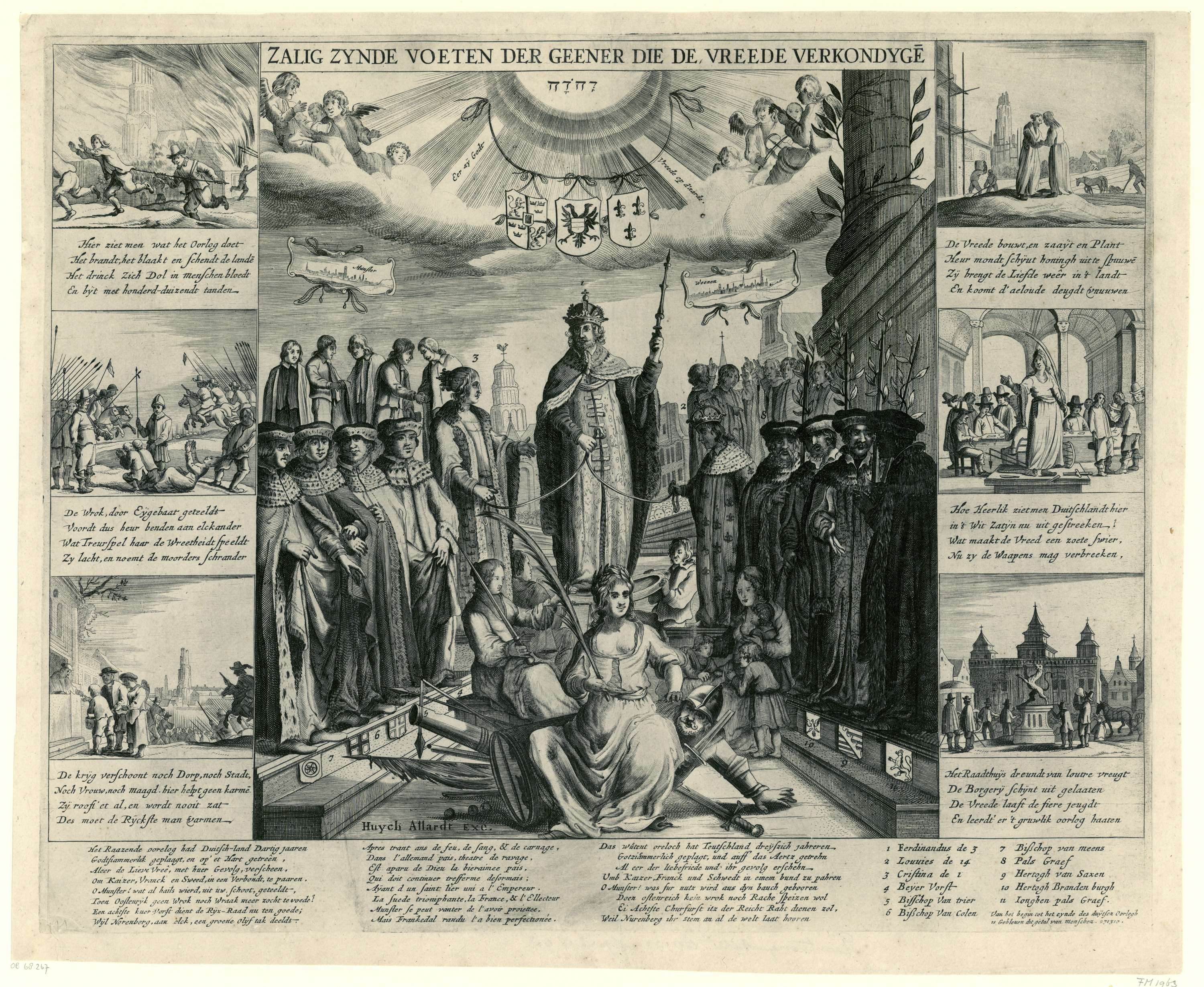 Allegorie op de Vrede van Westfalen in 1648. De centrale voorstelling toont de Duitse keizer Ferdinand III omringd door andere vorsten. Aan zijn voeten de Vrede en de verslagen Oorlog. In het onderschrift 3 verzen in het Nederlands, Frans en Duits. Om de centrale scène zes kleine randvoorstellingen elk met Nederlandse verzen van 4 regels.