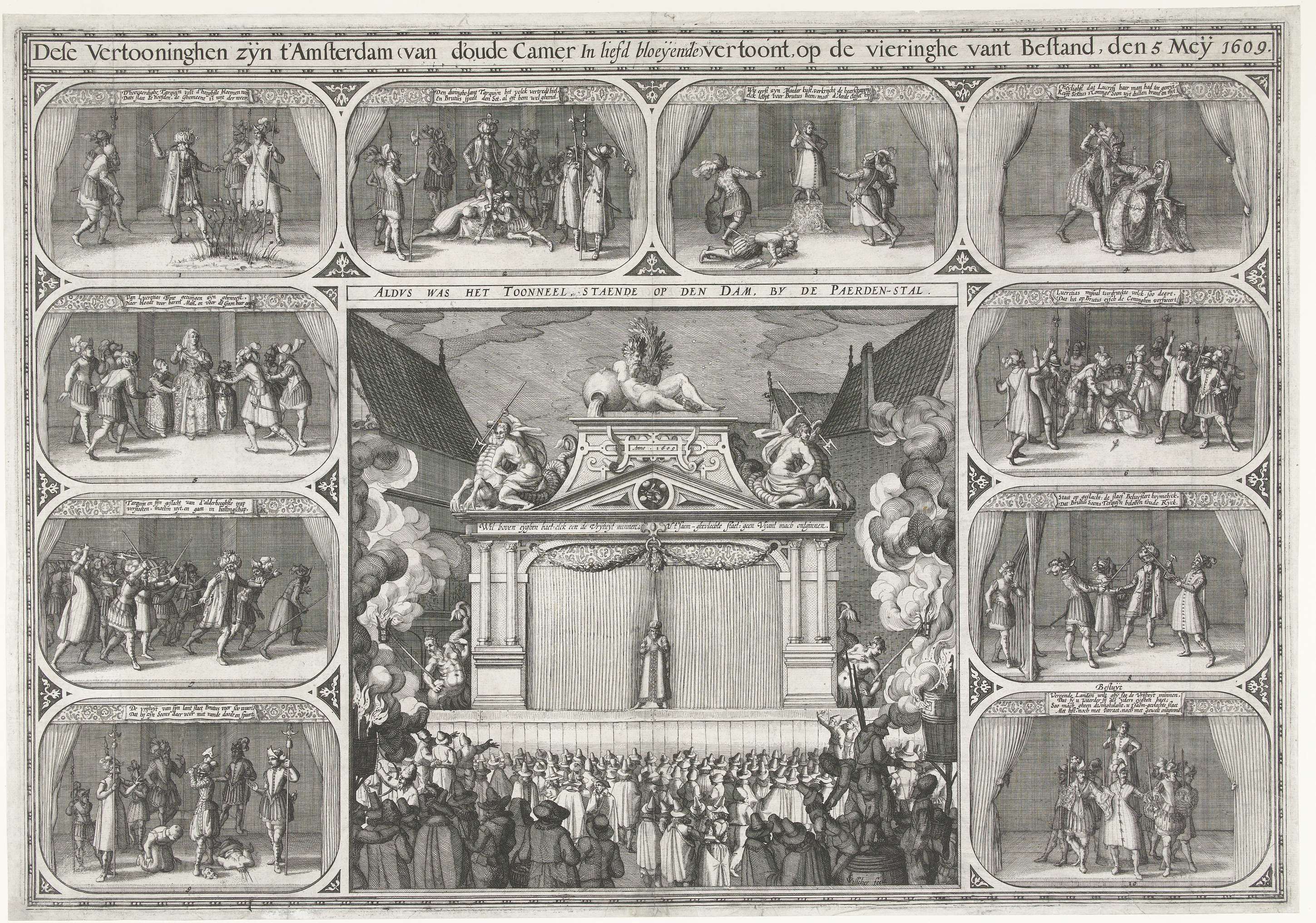 Toneelspel op de Dam bij de viering van het Twaalfjarig Bestand, op 5 mei 1609