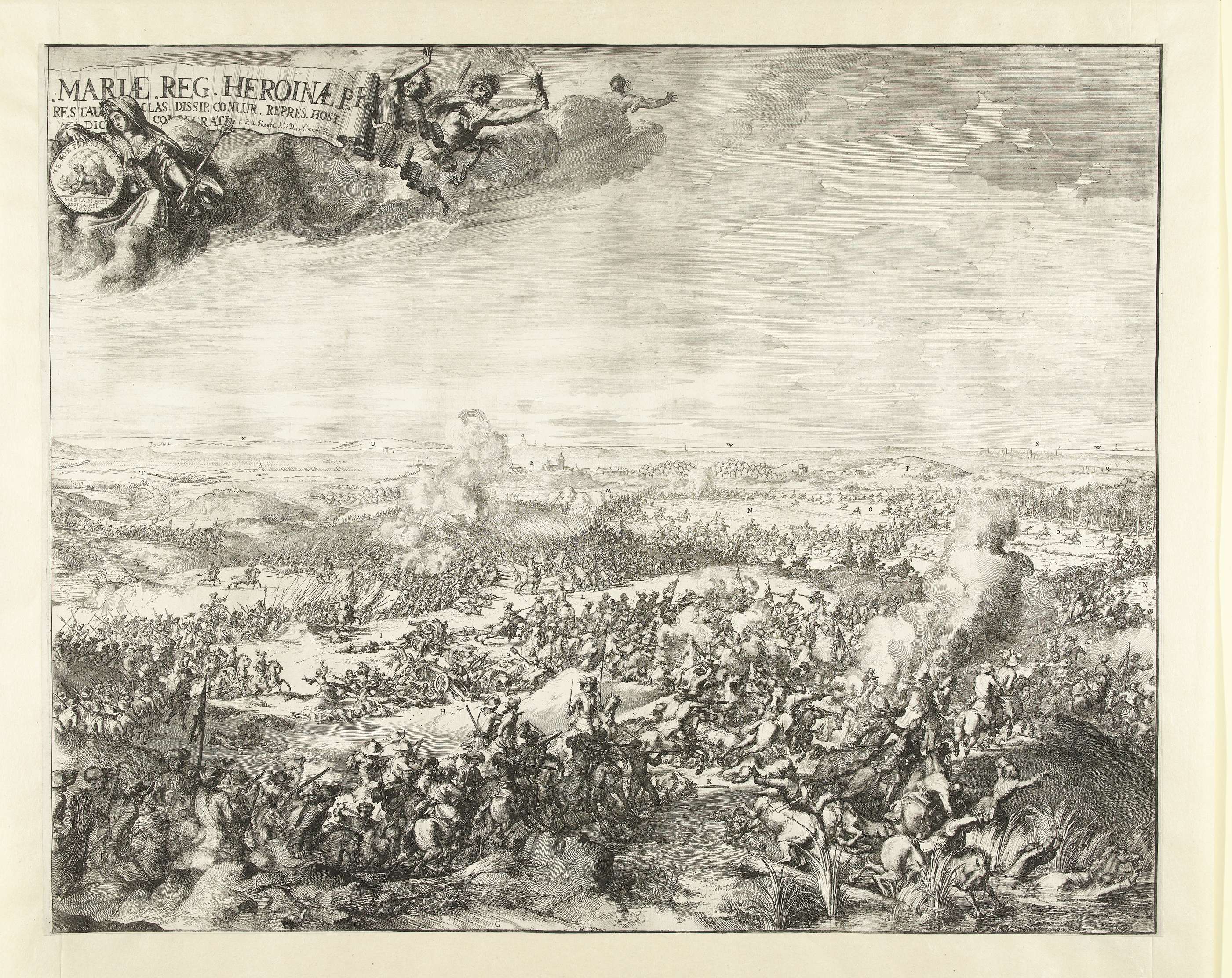 Overwinning van Willem III aan de Boyne, 1690. Geheel samengesteld uit drie losse prenten en twee tekstbladen. Rechterhelft van de hoofdvoorstelling met een gezicht op de veldslag. Bovenaan in de wolken een deel van de opdracht met allegorische figuren.