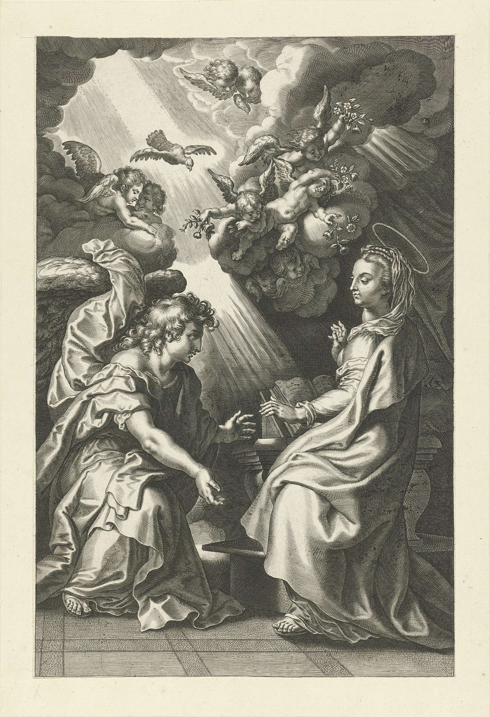 Maria zit op een stoel. Ze wordt bezocht door de engel Gabriël. Hij vertelt haar dat zij een zoon zal baren die Christus zal heten. Boven in de wolken verschillende engeltjes. De Heilige Geest (een duif) daalt uit de hemel neer. De prent is deel van een serie met scènes uit het Oude en Nieuwe ...