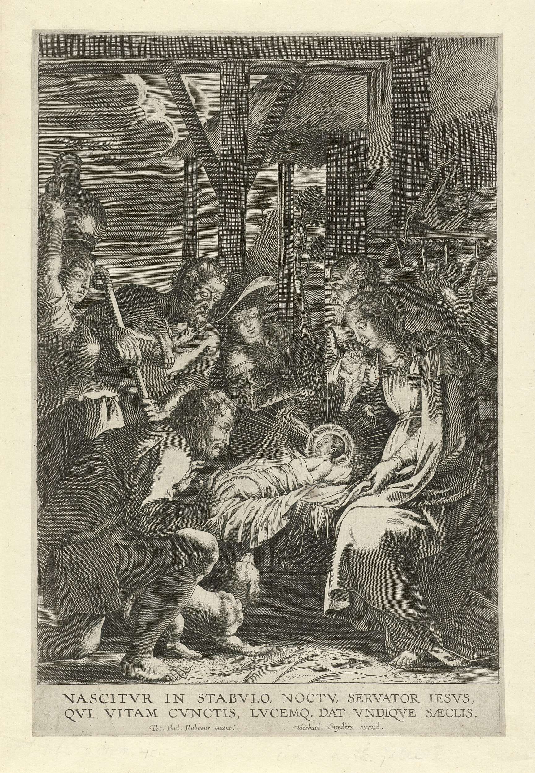 Herders en vrouwen bezoeken de Heilige Familie in de stal en knielen voor het Christuskind. Maria en Jozef staan achter de kribbe. Op de achtergrond liggen de os en de ezel. Kopie in spiegelbeeld. De prent heeft een Latijns onderschrift.