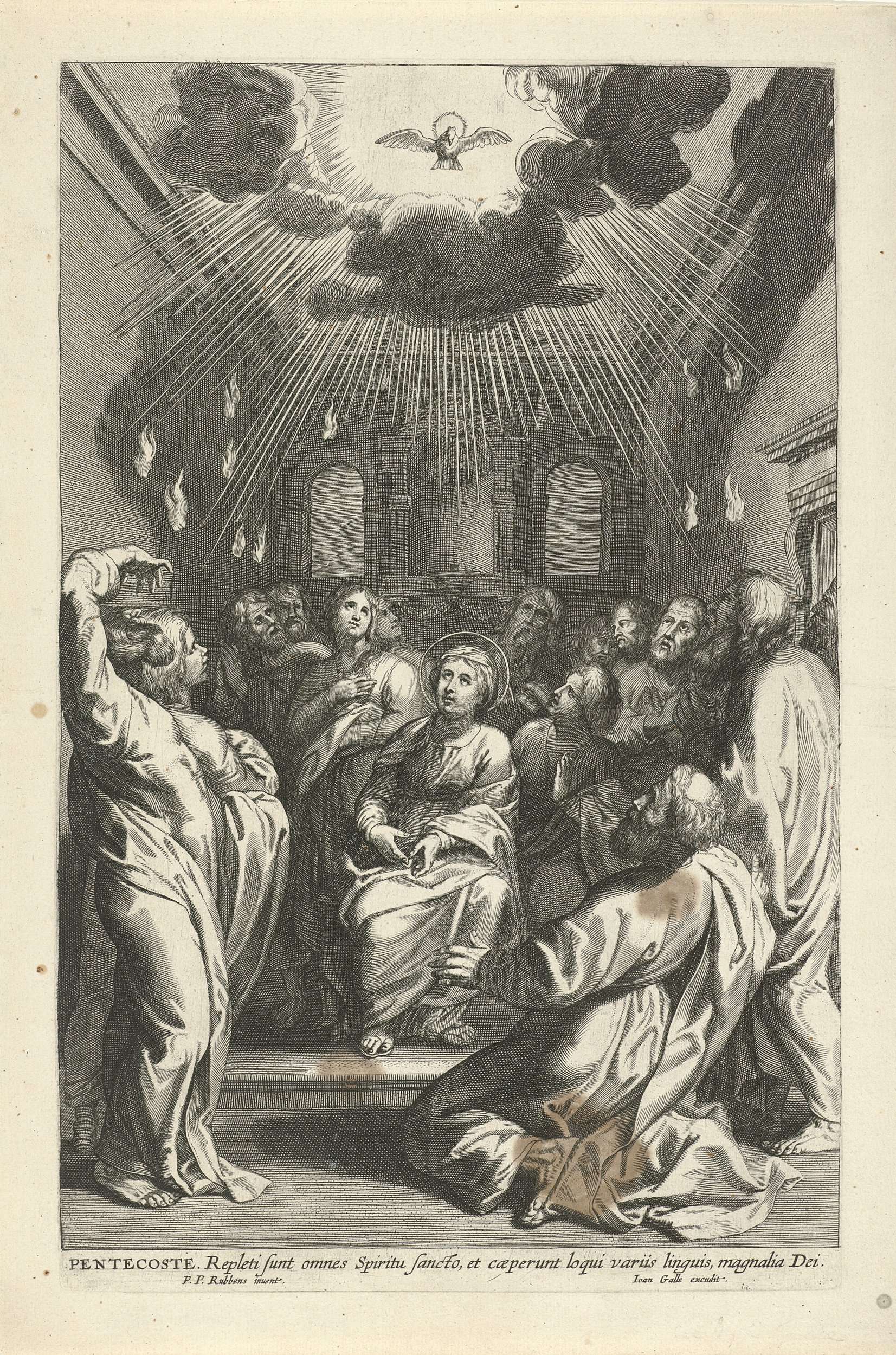 Maria en de leerlingen van Christus zitten in een kamer. Temidden van de groep verschijnt de duif van de Heilige Geest. Boven de hoofden van de apostelen en Maria branden vurige tongen, symbool van de uitstorting van de Heilige Geest in hun harten. De prent heeft een Latijns onderschrift.
