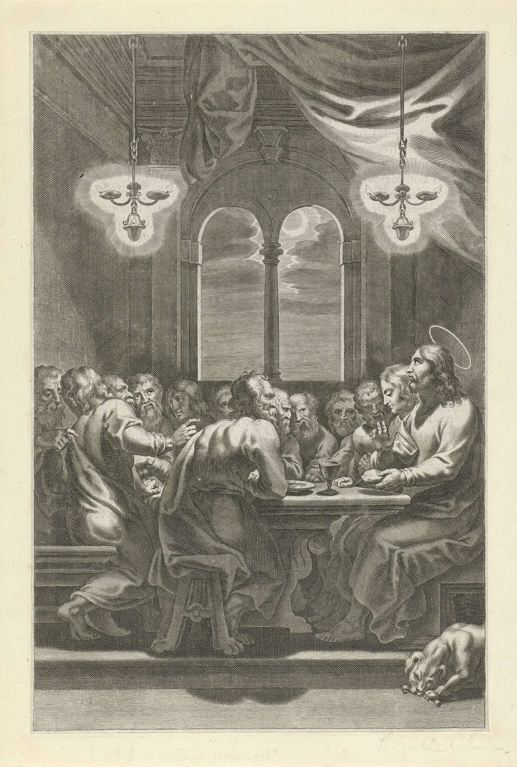 Christus zit samen met zijn leerlingen aan een tafel. Hij deelt het brood uit. De prent is deel van een serie met scènes uit het Oude en Nieuwe Testament.