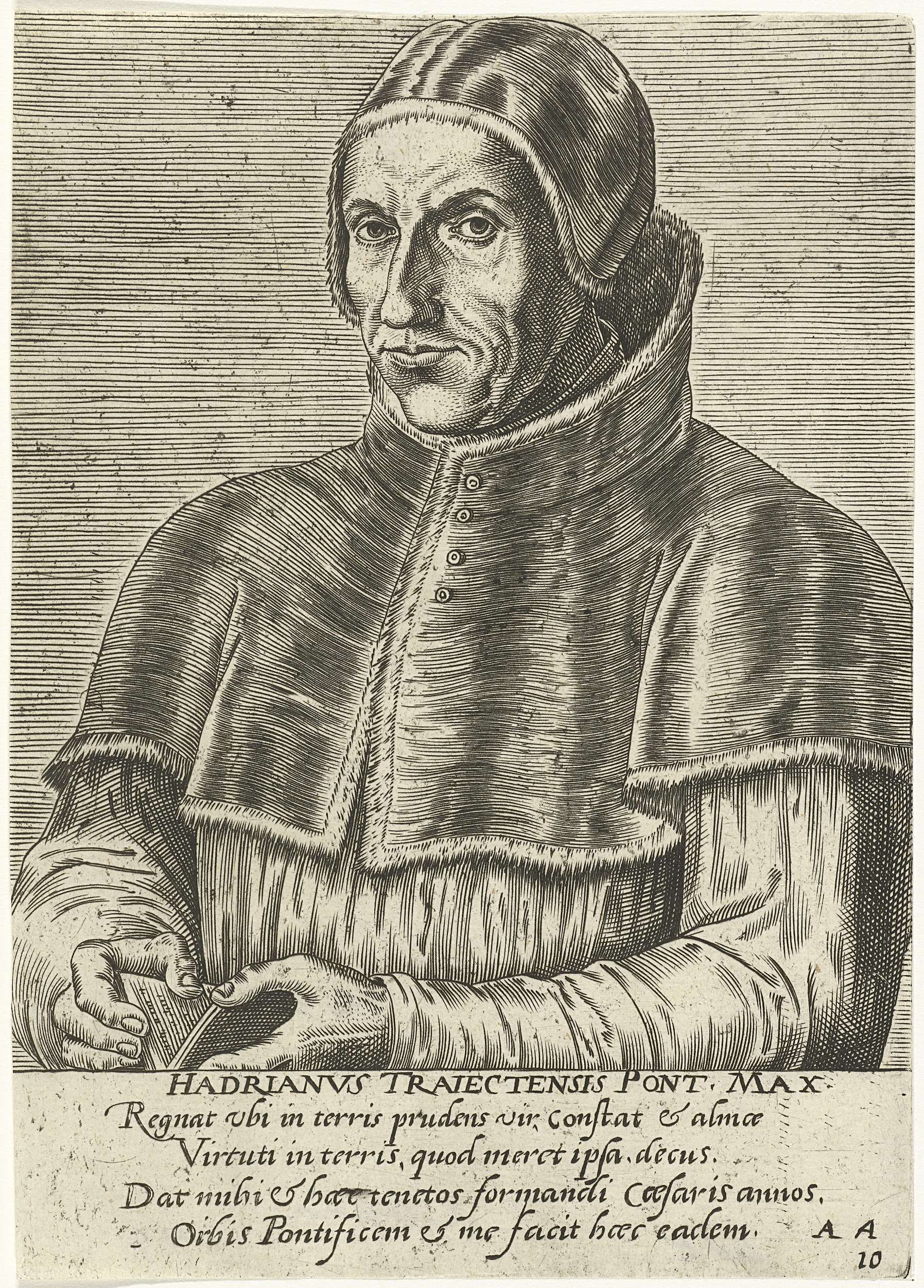 Portret van paus Adrianus VI. Buste naar links. Genummerd A4.10 . De prent heeft een Latijns onderschrift en maakt deel uit van een serie van beroemde Europese geleerden.