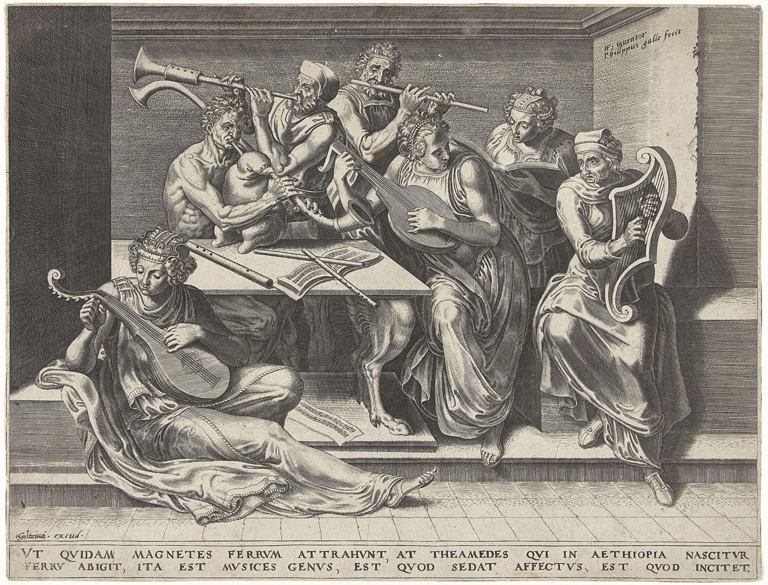 Zeven muzikanten rondom een tafel. Zes spelen instrumenten (2 x luit, lier, doedelzak, schalmei, en dwarsfluit). Een vrouw zingt. De prent heeft een Latijns onderschrift.