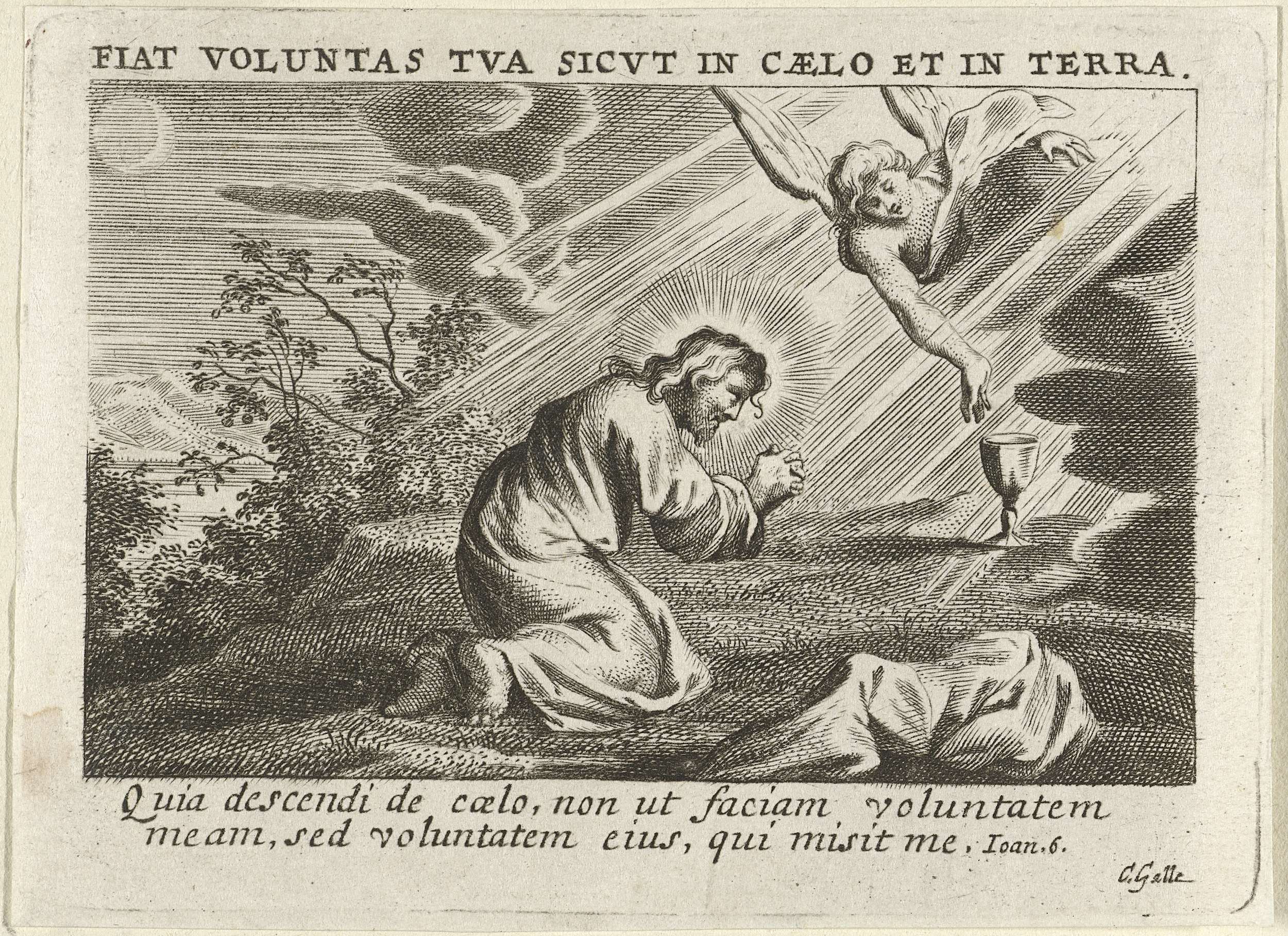 Christus knielt 's nachts op de olijfberg en bidt. Een engel brengt hem een kelk. Onder de voorstelling een Latijns vers uit Joh. 6.