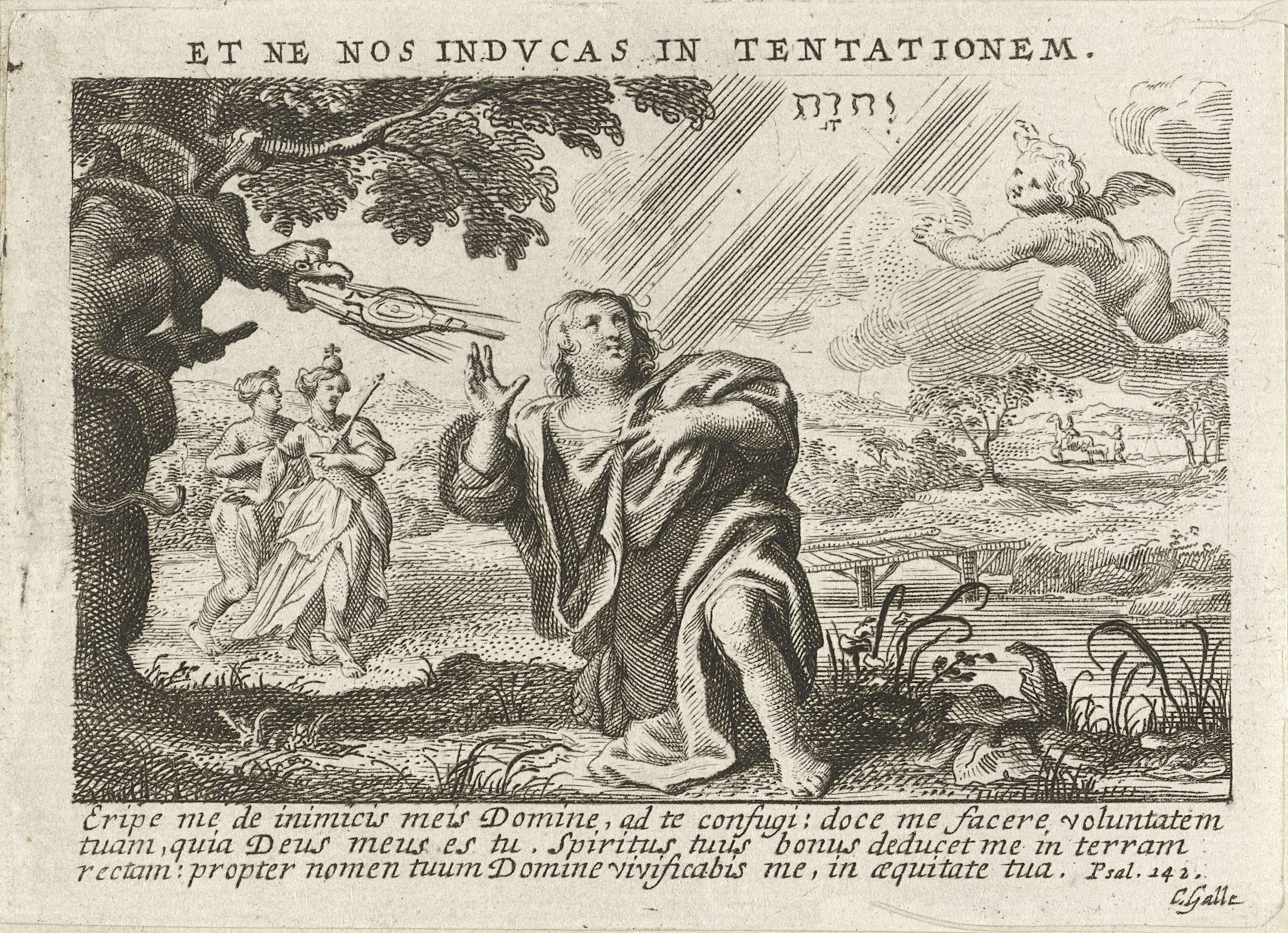 Uitbeelding van Mat. 6,13: En breng ons niet in beproeving, maar red ons uit de greep van het kwaad. Een man knielt op de grond, een duivel blaast hem met een blaasbalg beproevingen in zijn oor. De mens weert de woorden van de duivel af en kijkt naar de naam van God die in de ...