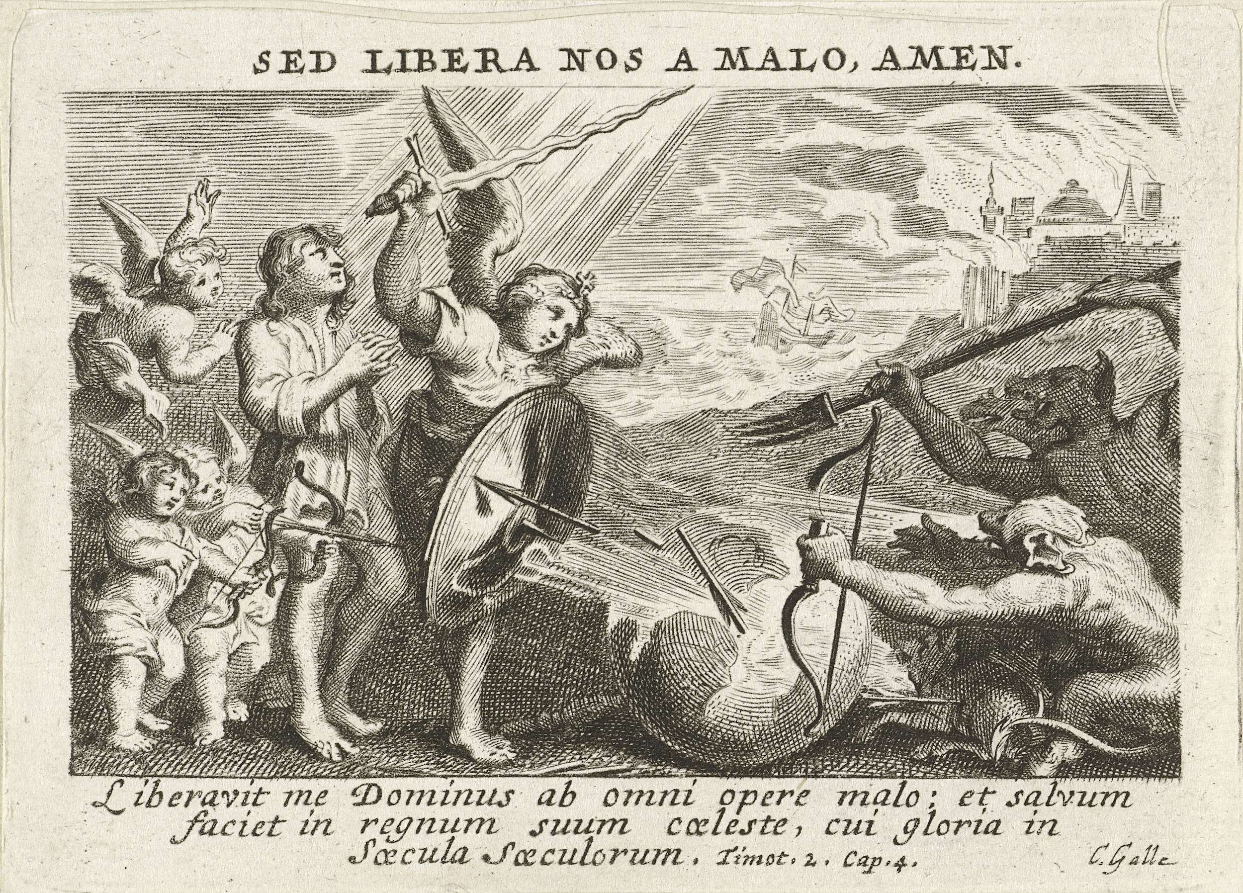 Uitbeelding van Mat. 6,13: En breng ons niet in beproeving, maar red ons uit de greep van het kwaad. Een aartsengel verdedigt de mens tegen een groepje duivels. Op de achtergrond een schip in stormachtig weer.