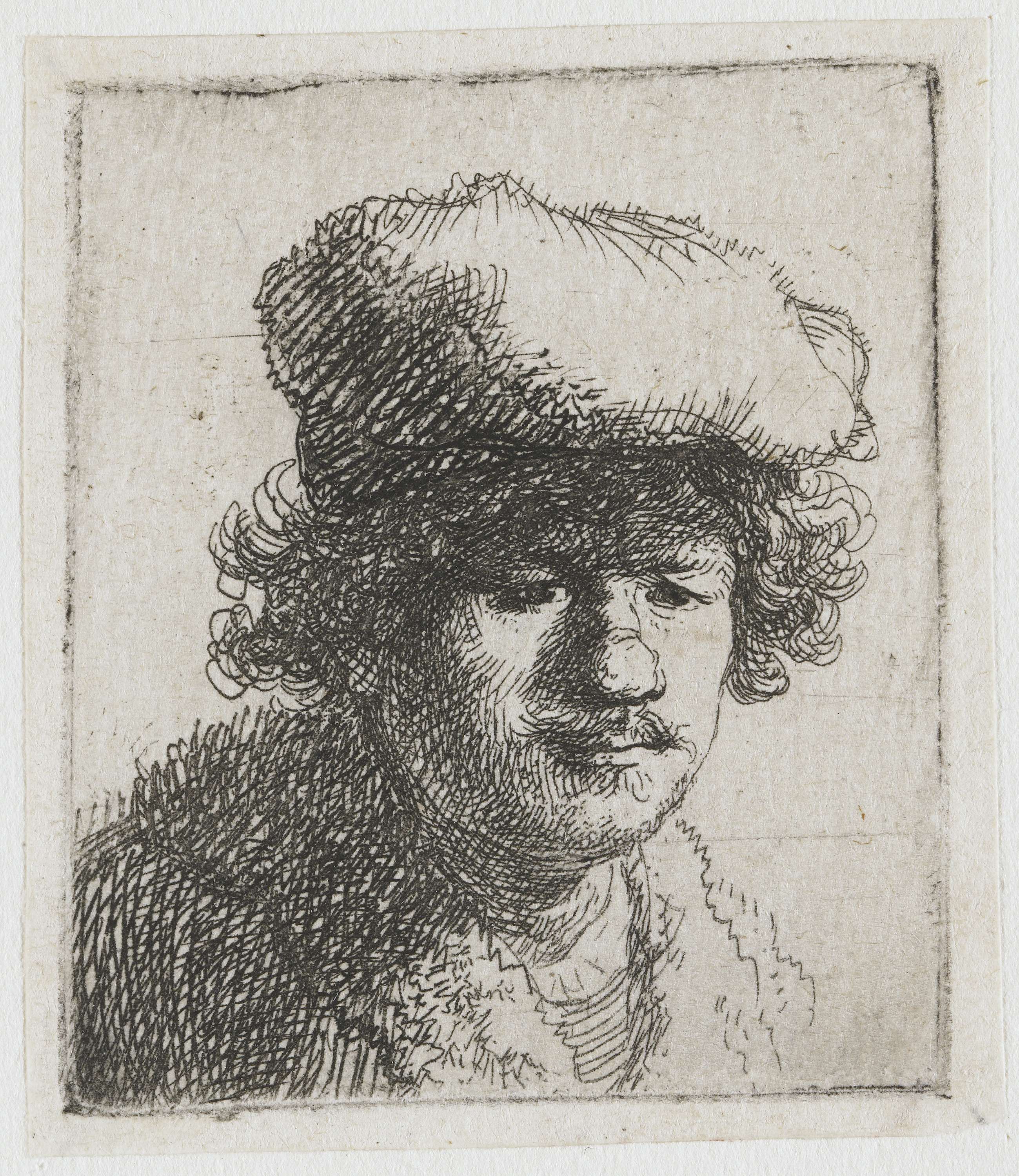 Rembrandt bezat ongetwijfeld een aanzienlijke collectie hoofddeksels. Hier toont hij zichzelf met respectievelijk een naar voren getrokken baret, een ‘kutchma’ (een Poolse bontmuts) en een fluwelen baret met klep. Overigens was de baret in Rembrandts tijd al ouderwets en herinnerde vooral aan de 16de eeuw.