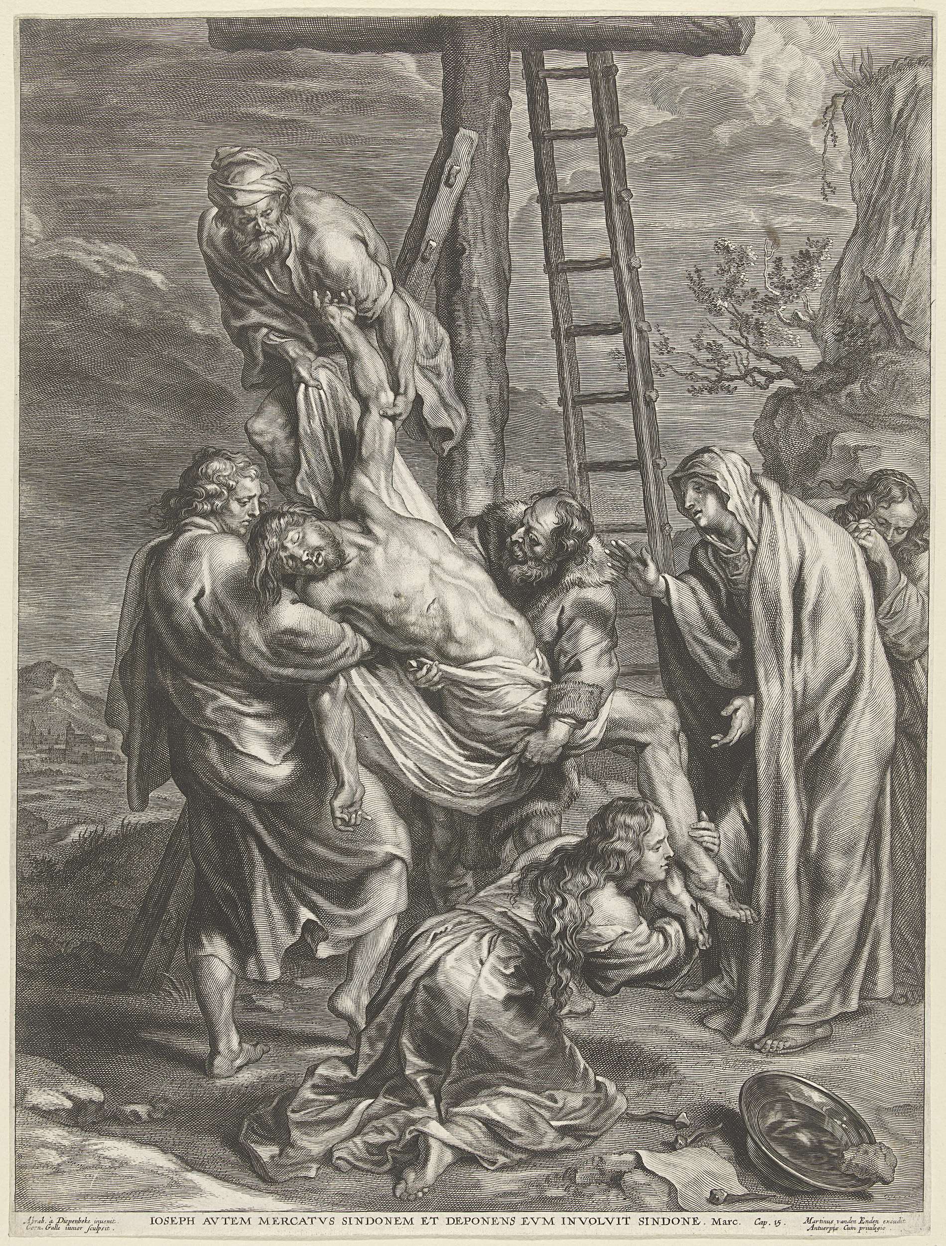 Jozef van Arimatea, Nikodemus en Johannes halen het lichaam van Christus van het kruis. Nikodemus staat op een ladder en houdt een arm van Christus vast. Johannes en Jozef nemen het lichaam van Christus in ontvangst. Maria Magdalena knielt op de grond en grijpt naar Christus voeten.
