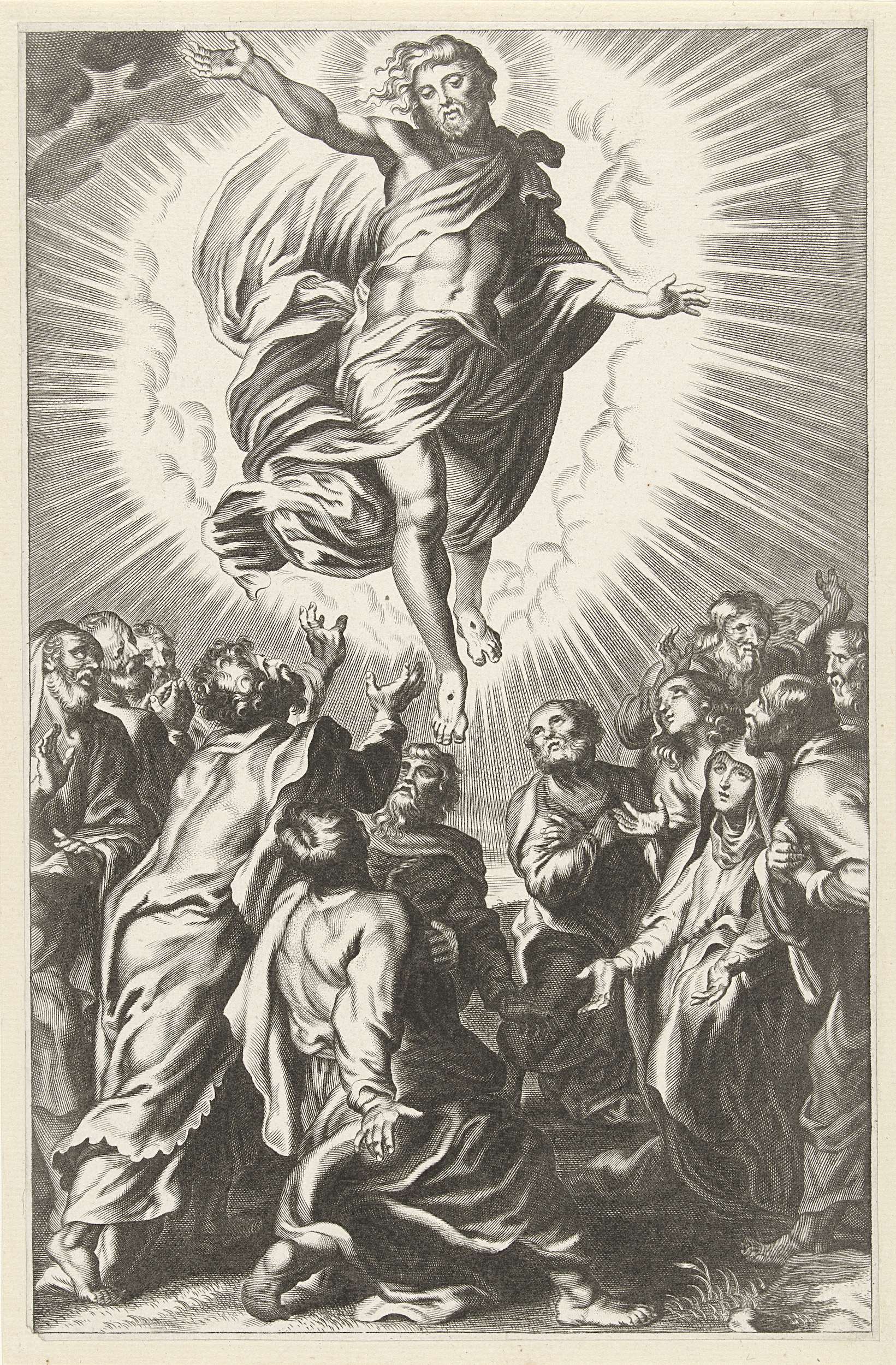 Christus zweeft in een stralenkrans en toont zijn wonden. De apostelen en Maria kijken naar hem op.