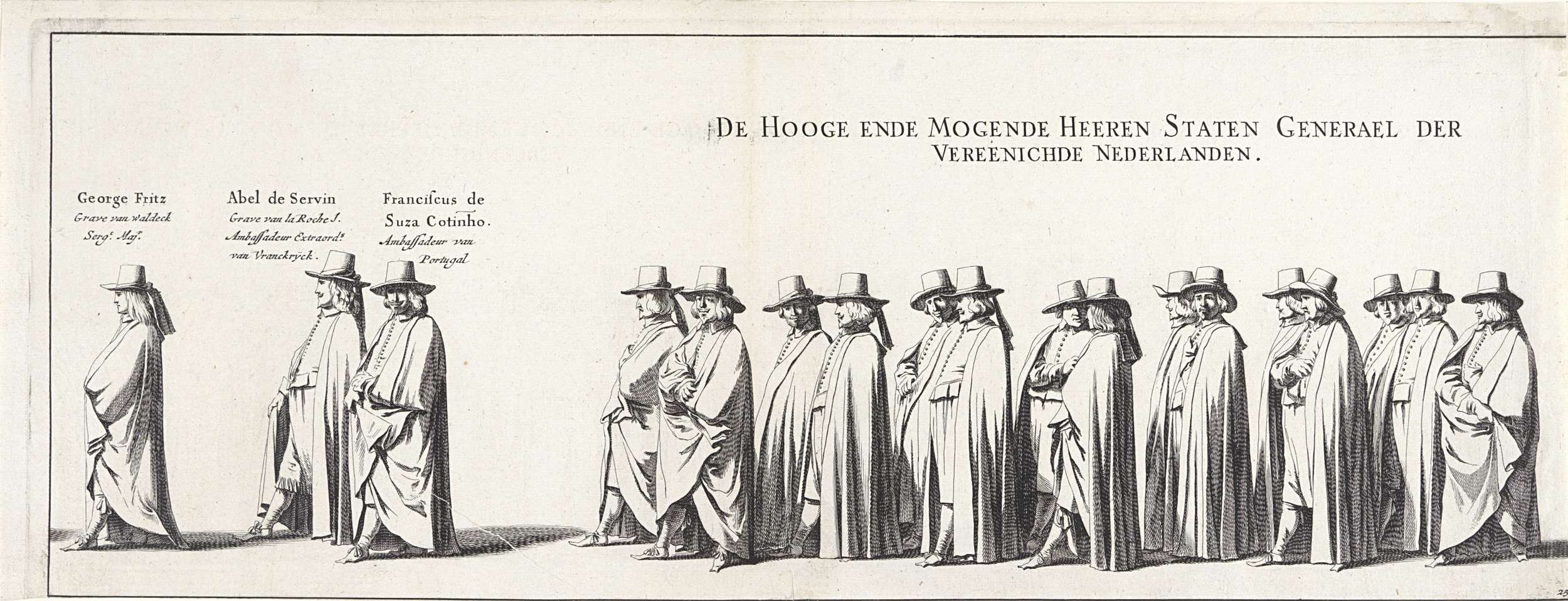De begrafenisstoet van stadhouder Frederik Hendrik te 's-Gravenhage op 10 mei 1647. Plaat nr. 25 met een deel van de stoet met leden van de Staten-Generaal, boven de personen staat hun functie. Onderdeel van een serie van 30 platen en 20 tekstbladen, bedoeld om aan elkaar geplakt te worden.