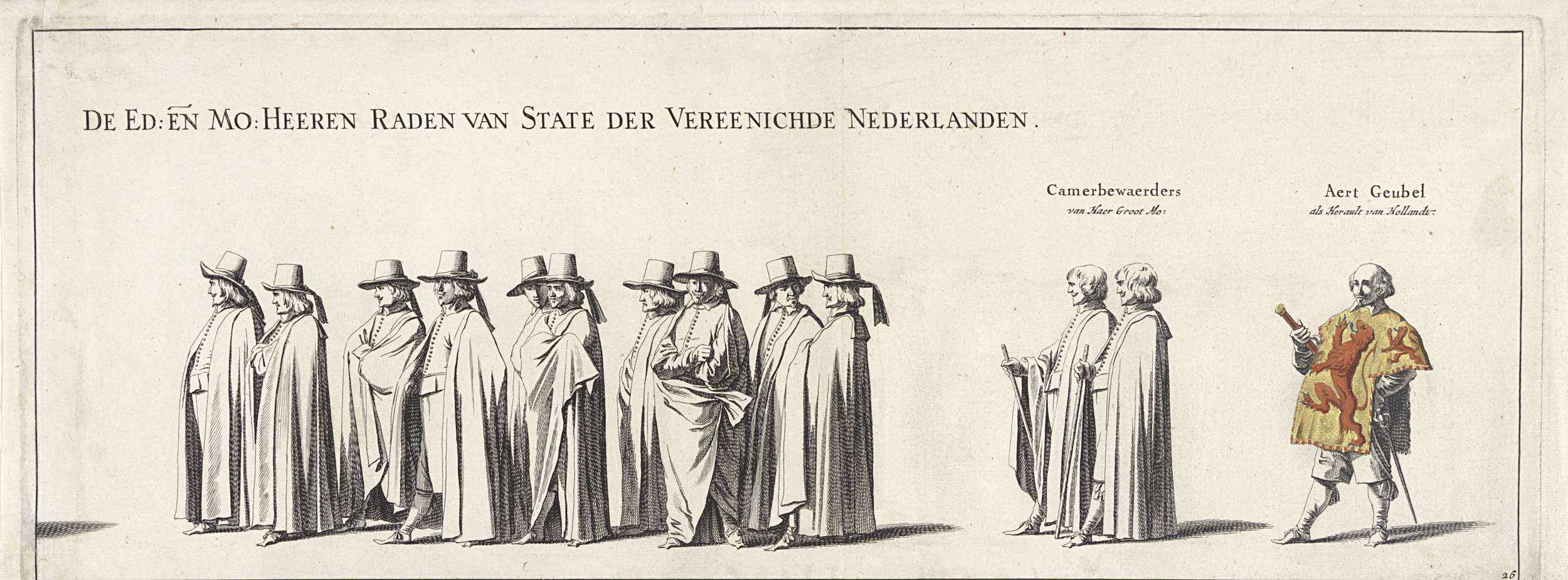De begrafenisstoet van stadhouder Frederik Hendrik te 's-Gravenhage op 10 mei 1647. Plaat nr. 26 met een deel van de stoet met leden van de Staten-Generaal, boven de personen staat hun functie. Onderdeel van een serie van 30 platen en 20 tekstbladen, bedoeld om aan elkaar geplakt te worden.