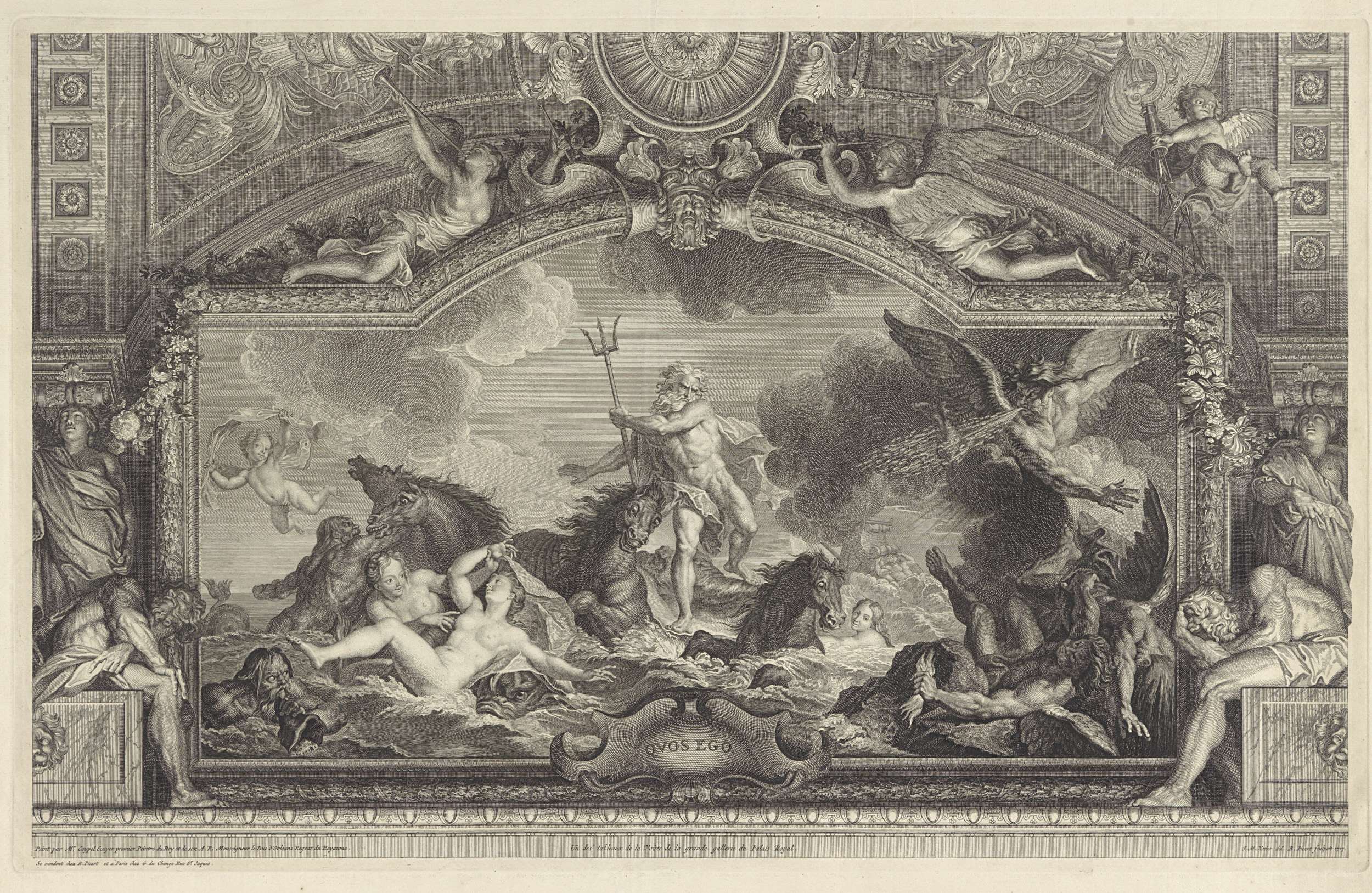 De vertoornde Neptunus, staande temidden van de golven in zijn wagen, bedreigt met zijn drietand de winden. Op de achtergrond een zinkend Trojaans schip. De voorstelling is gevat in een ornamentele lijst bekroond door twee figuren van de Faam. Rechtsboven Amor, die zijn pijlen uit zijn koker strooit.