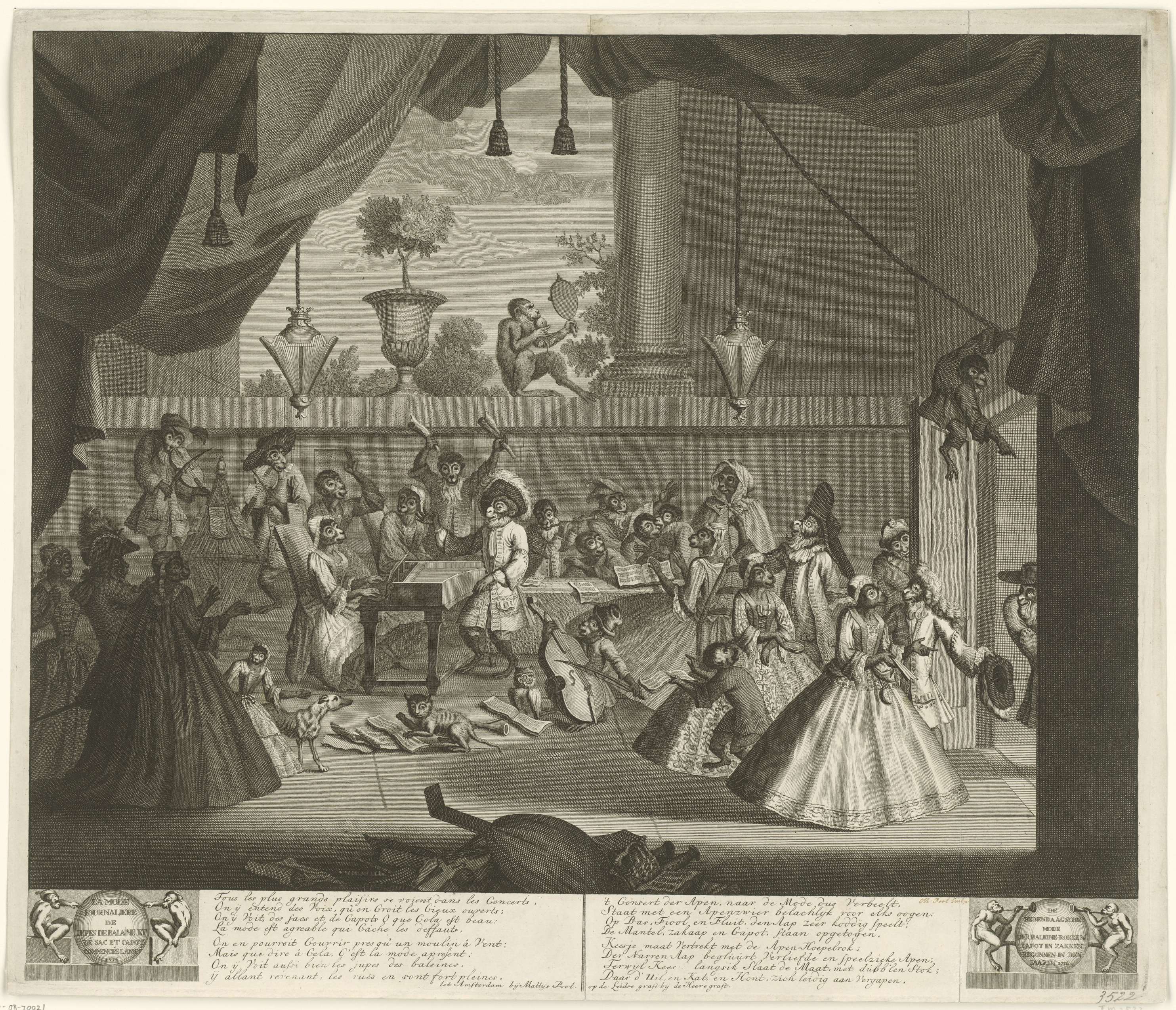 Spotprent op de mode van 1716. Zaal met een concert met muzikanten en publiek bestaande uit apen gekleed in de mode van de dag met grote hoepelrokken met baleinen, 1716. Bovenaan op de balustrade een ongeklede aap met een spiegel. Met onderschrift in het Frans en Nederlands.
