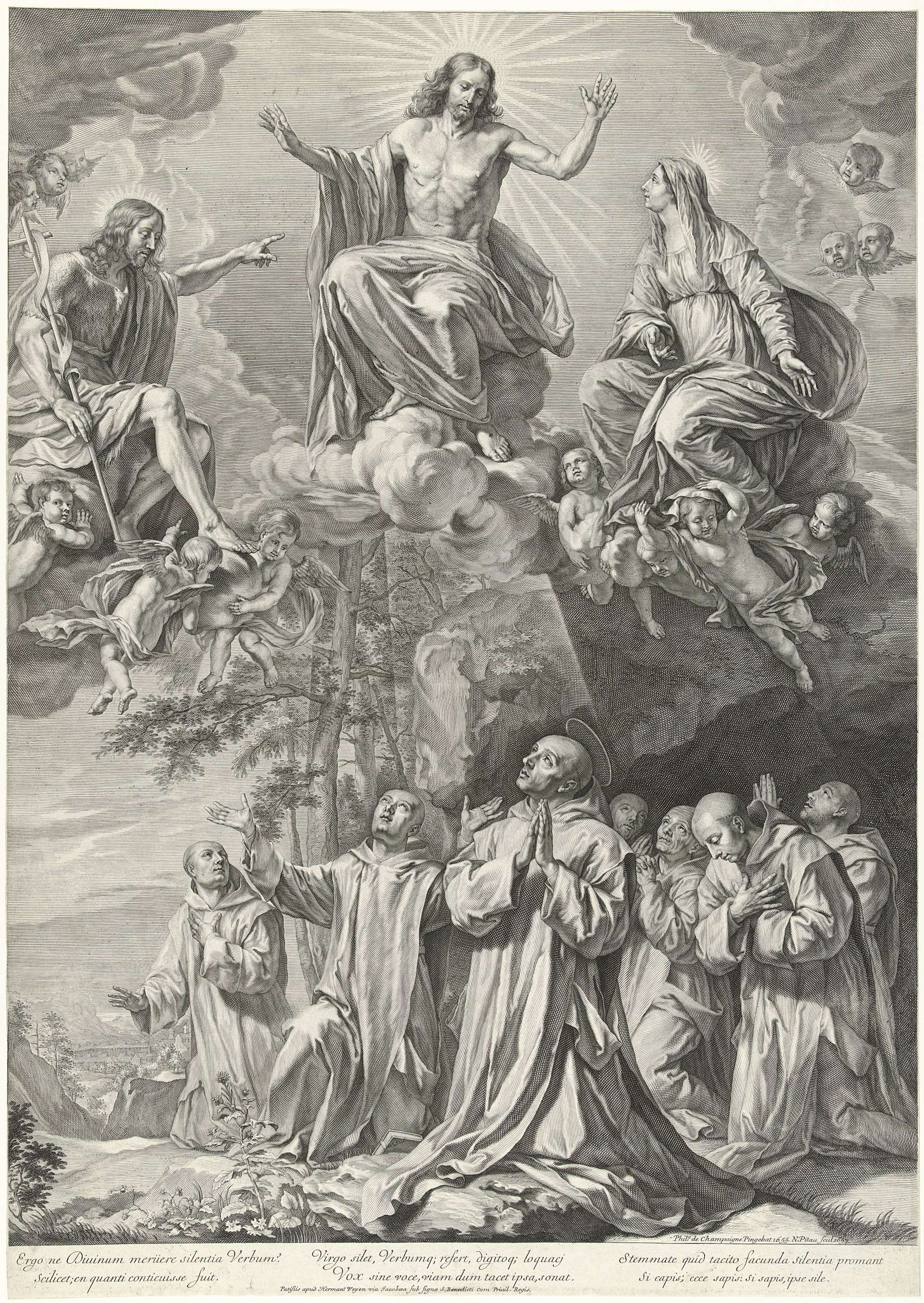 Berglandschap met de Heilige Bruno in monnikshabijt, in gezelschap van zijn metgezellen. Hij bidt geknield en kijkt op naar goddelijke stralen die vanuit de hemel op hem schijnen. Op wolken boven hen zitten Christus, Maria en Johannes de Doper. Christus maakt een zegenend gebaar. In de marge een zesregelig onderschrift, in drie kolommen, in het ...