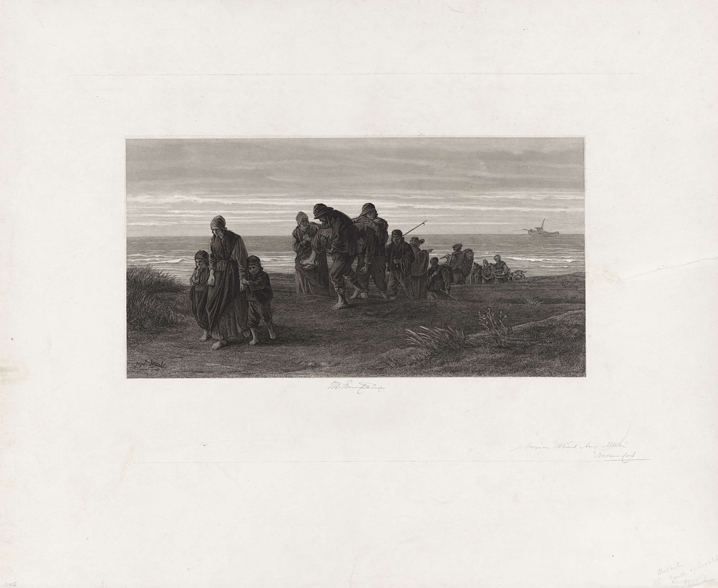 Een schipbreukeling wordt door een slinger mensen vanaf het strand door de duinen weggedragen. Op de achtergrond de zee met een zeilschip.