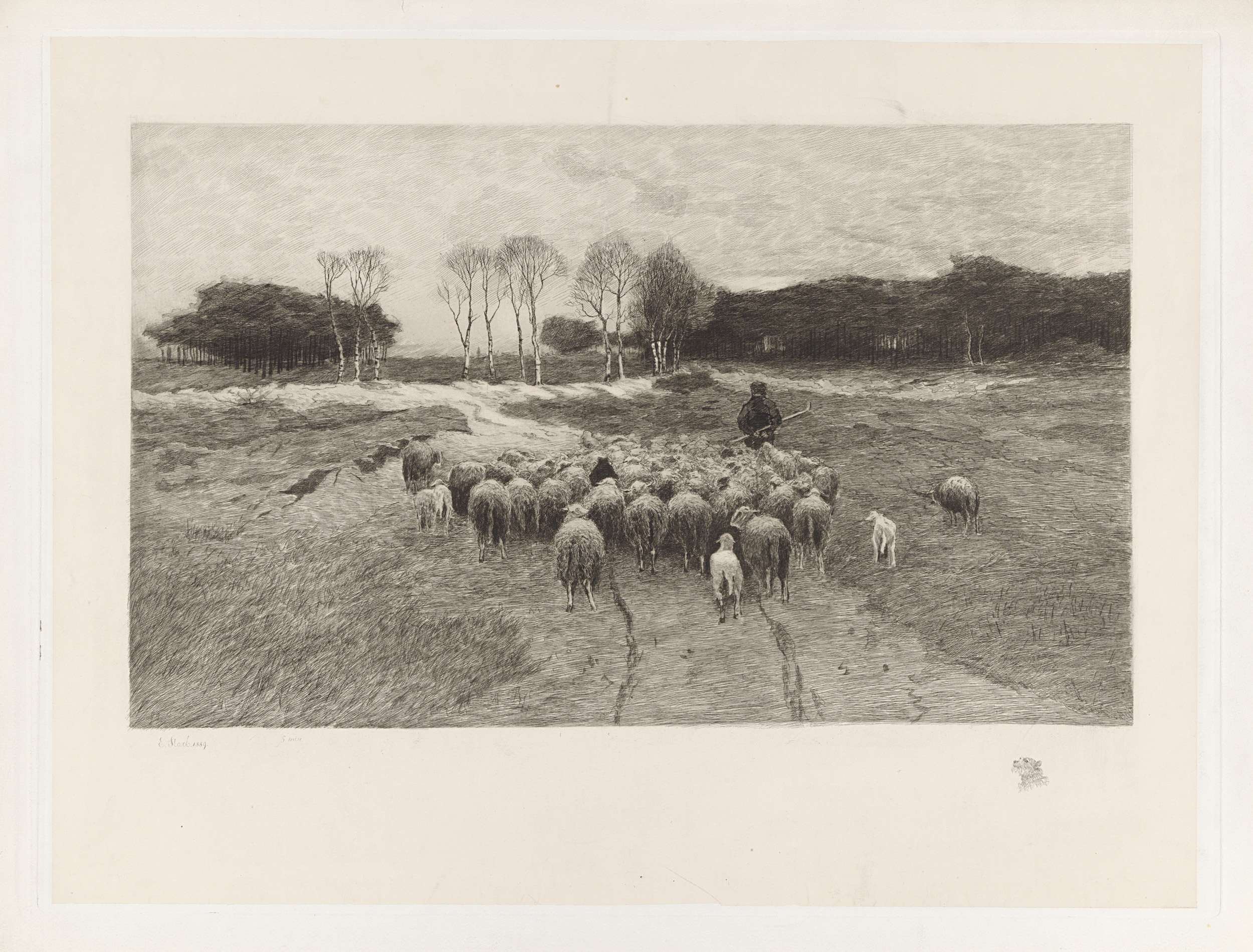 Een schaapherder gevolgd door zijn kudde op de heide. Op de achtergrond berken en een bos. Rechtsonder in de marge een hondenkop.