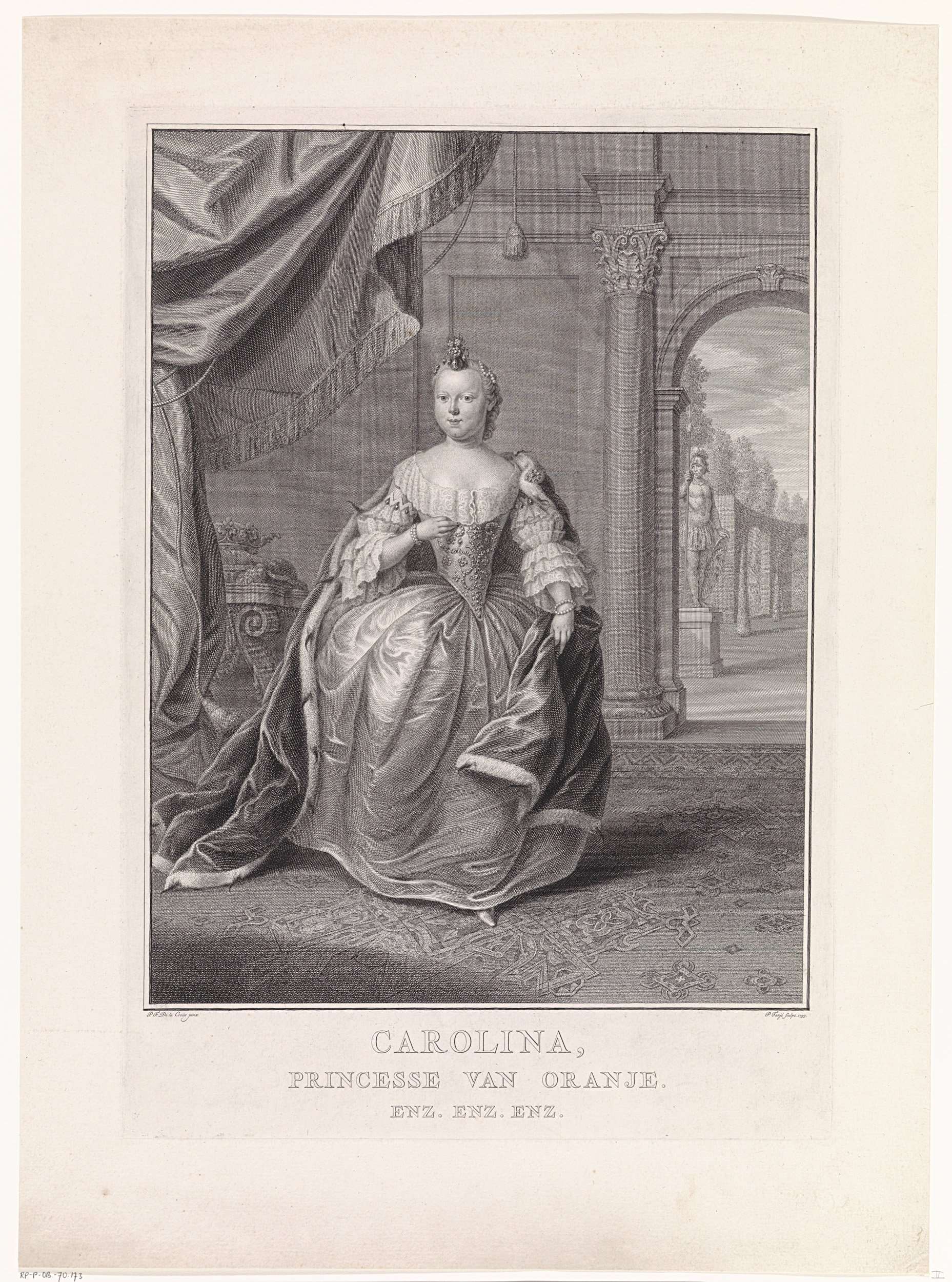 Portret van Carolina, prinses van Oranje-Nassau, gekleed in een hermelijnen mantel. Op de achtergrond een poort naar een tuin.