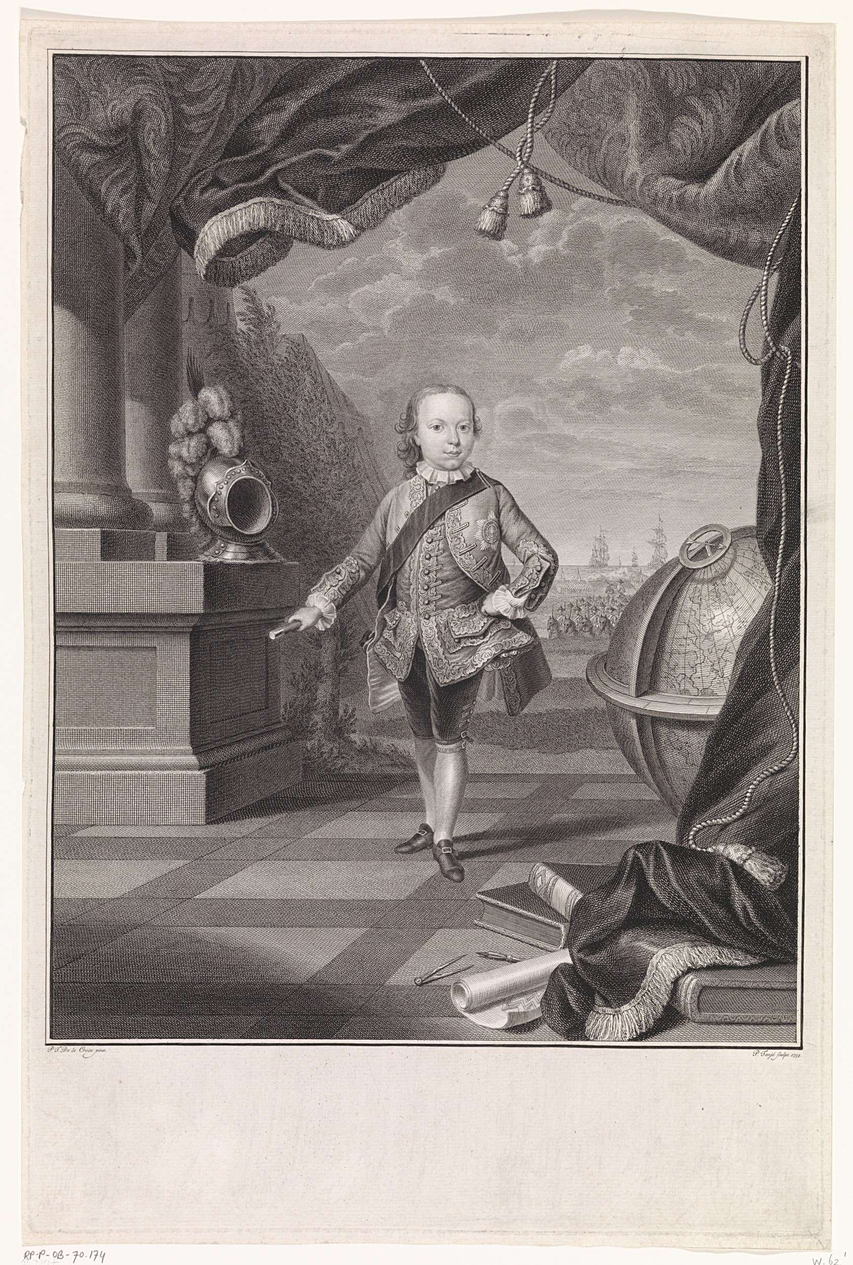 Portret van Willem V, prins van Oranje-Nassau, als kapitein-generaal en admiraal van de Verenigde Nederlanden. Hij staat met een commandostaf in zijn hand onder een baldakijn. Rechts een globe, op de achtergrond een leger en een vloot.