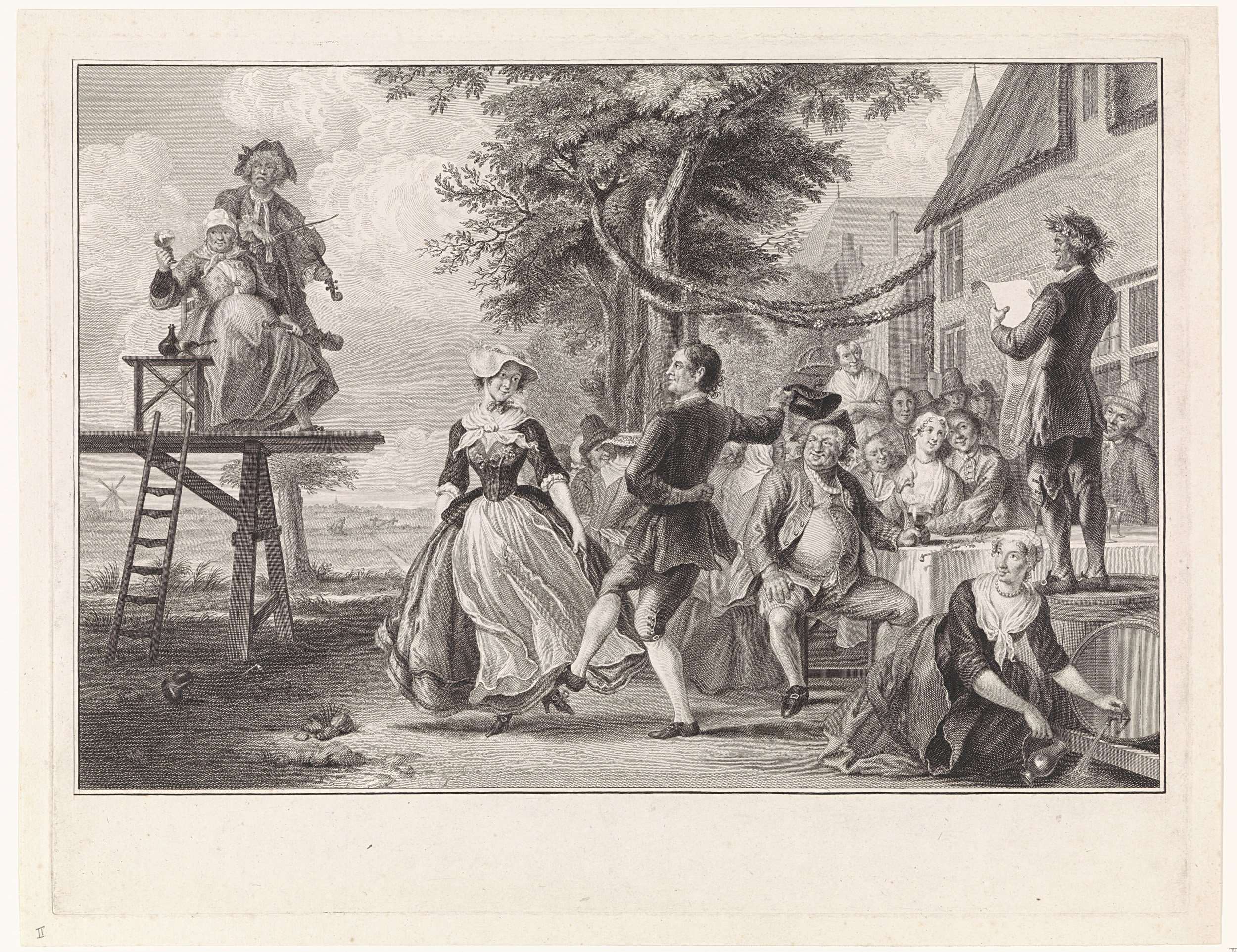 Cloris en Roosje dansen op hun bruiloft. Op de verhoging twee vioolspelers, van wie de vrouw het glas heft. Rechts de feestgangers en een man, die vanaf een ton een toespraak houdt. Scène uit het zangspel De bruiloft van Cloris en Roosje.