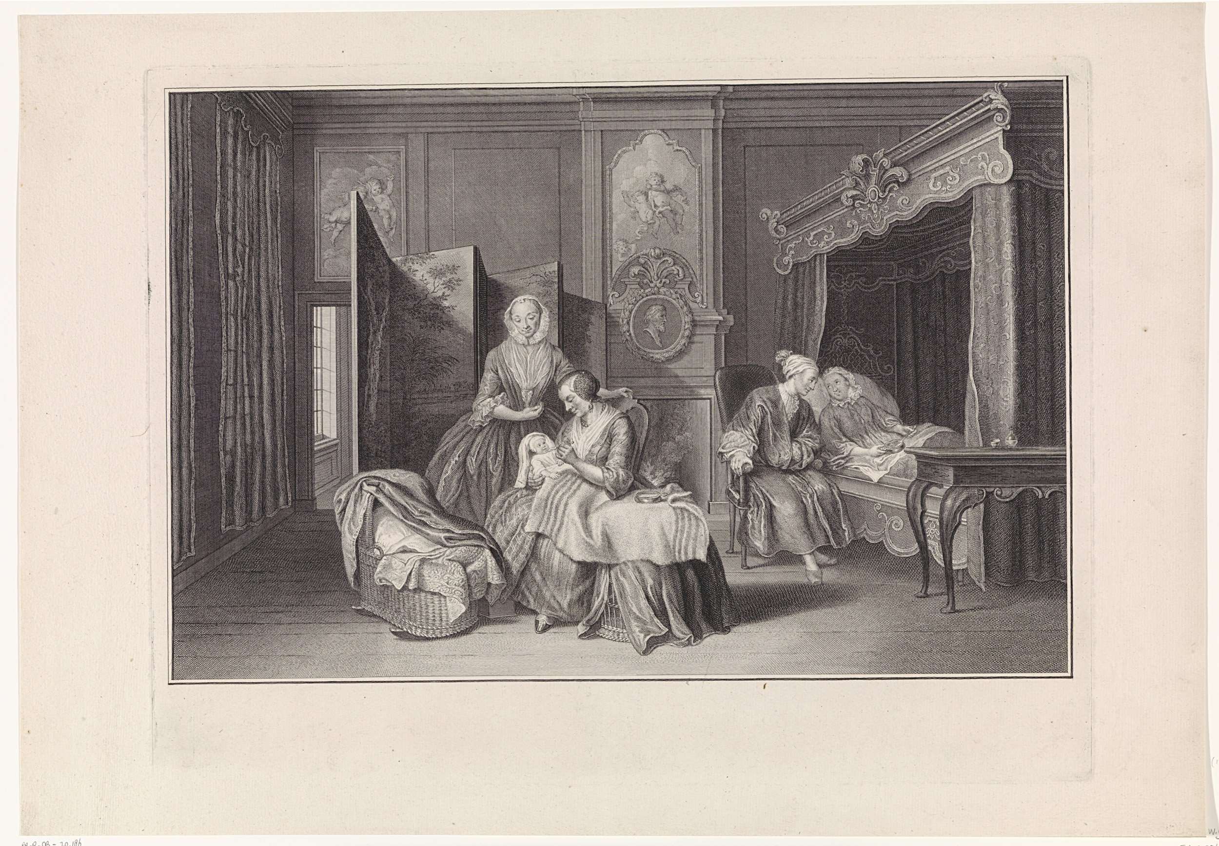 In de kraamkamer geeft een min de baby te eten, terwijl een andere vrouw toekijkt. Rechts ligt de moeder in een hemelbed. Naast haar zit haar man.