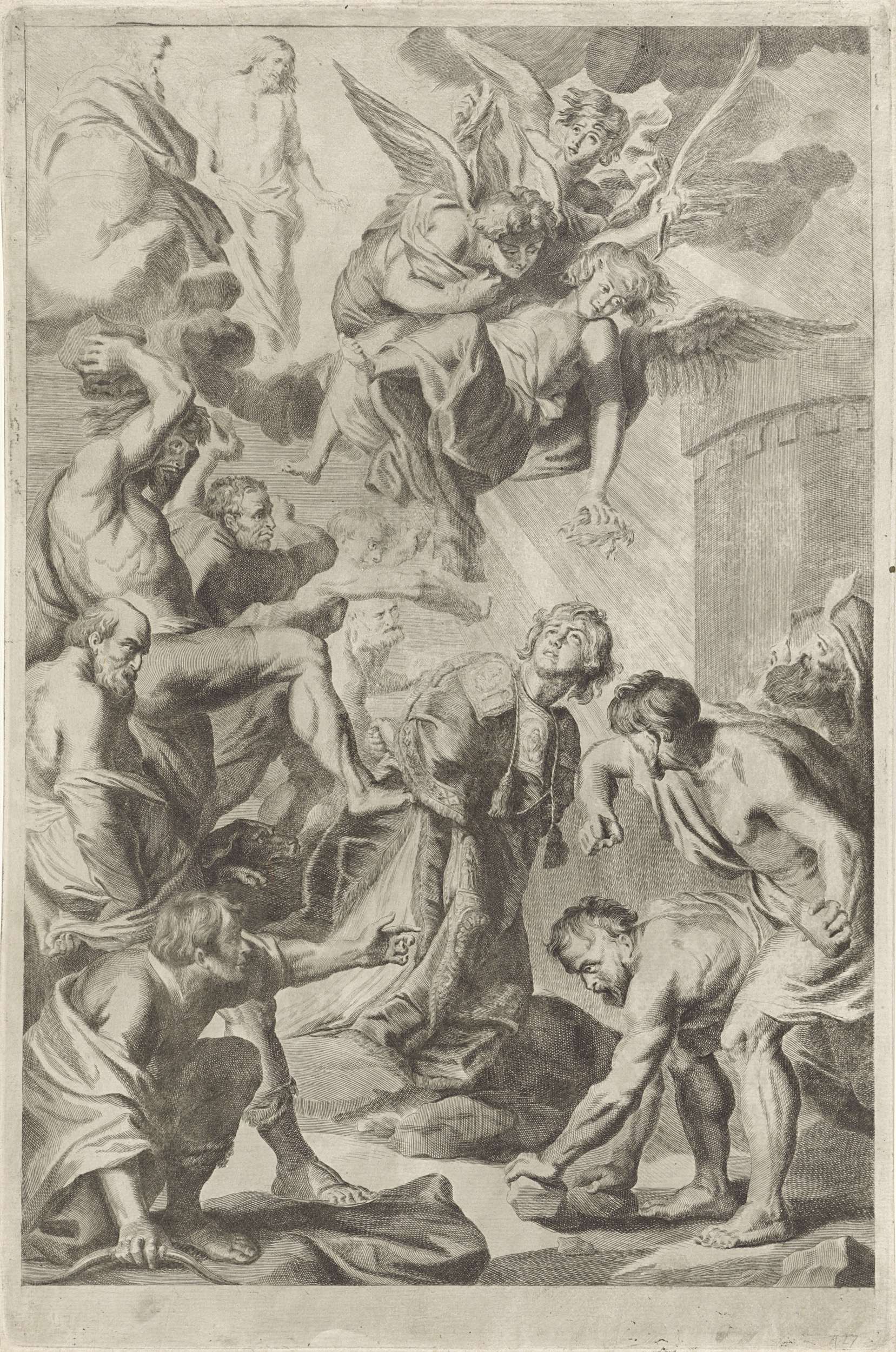 De steniging van de heilige Stefanus. In de hemel God de Vader en Christus en een drietal engelen met een lauwerkrans en palmtak.