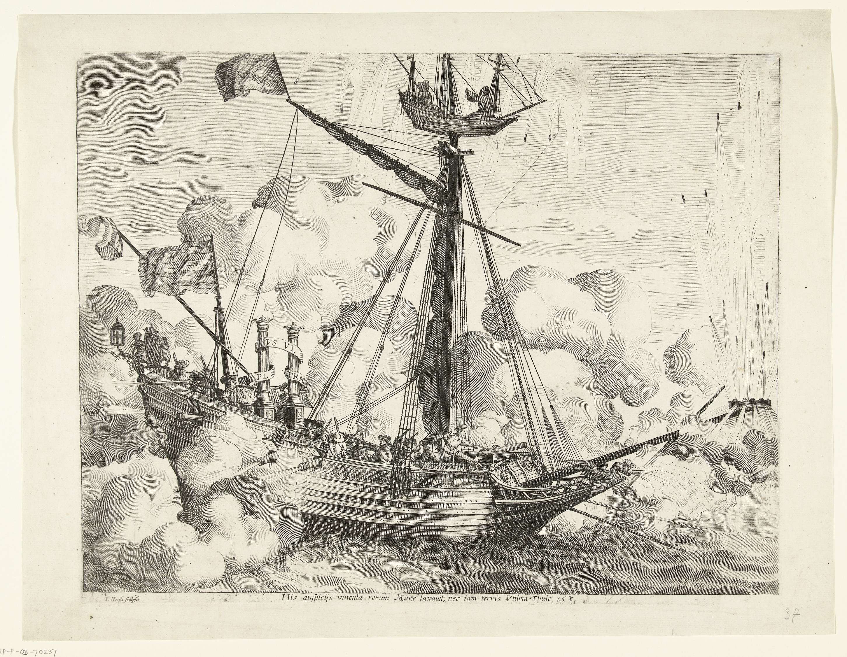 Spektakel met schip met vuurwerk, vurende kanonnen en de zuilen van Hercules. Blad nr. 37 in een geheel van 42 platen die de uitgave van de beschrijving van de intocht van de Kardinaal Infant Ferdinand van Oostenrijk te Gent op 28 januari 1635 als de nieuwe landvoogd voor de Spaanse Nederlanden illustreren.