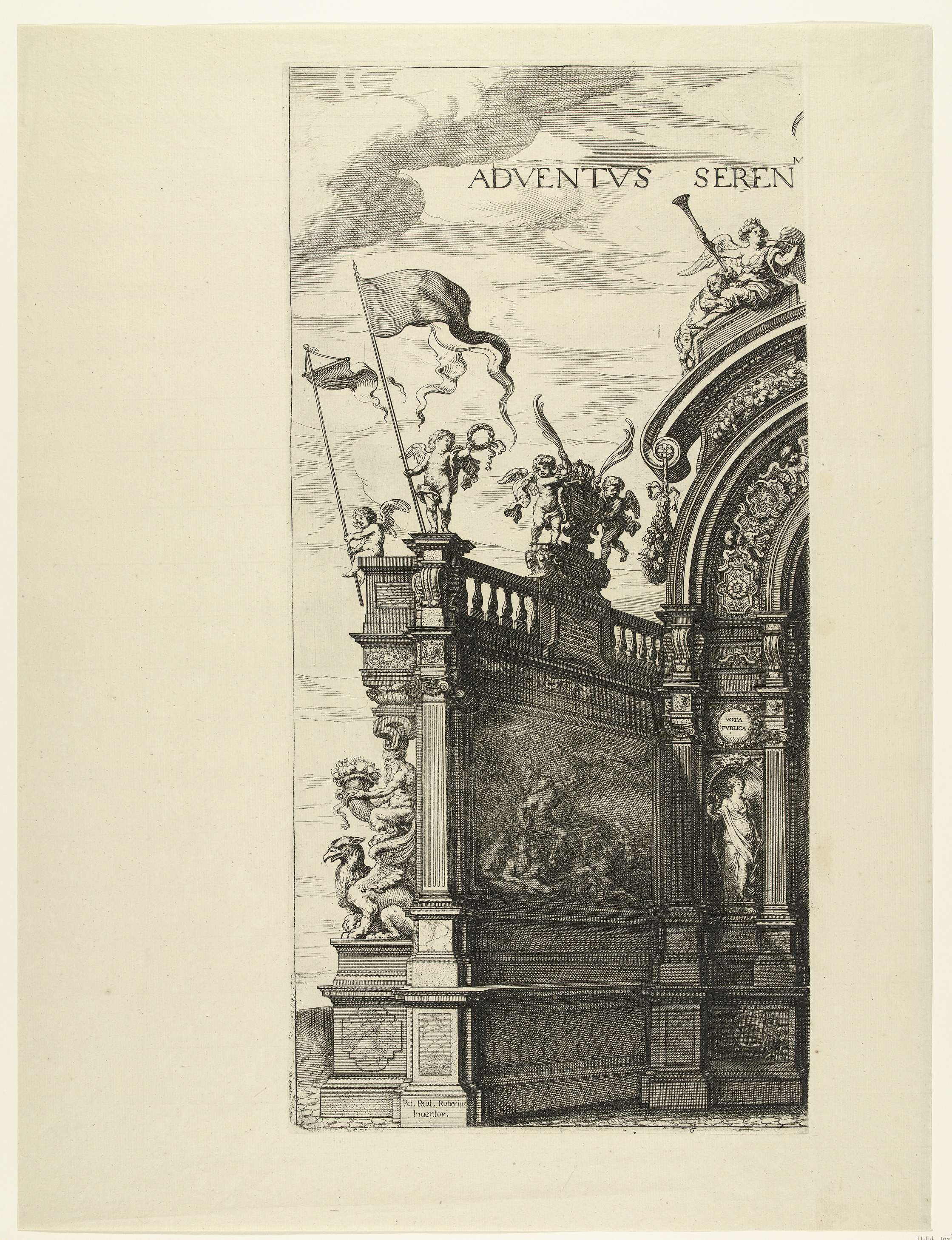 Het welkomsttoneel. Toneel opgebouwd uit drie hoofdvoorstellingen. Totaalbeeld van het toneel in twee bladen (ongemonteerd). Blad nr. 6 (linkerhelft) in een geheel van 43 platen die de uitgave van de beschrijving van de intocht van de Kardinaal Infant Ferdinand van Oostenrijk te Antwerpen op 17 april 1635 als de nieuwe landvoogd voor de Spaanse Nederlanden ...