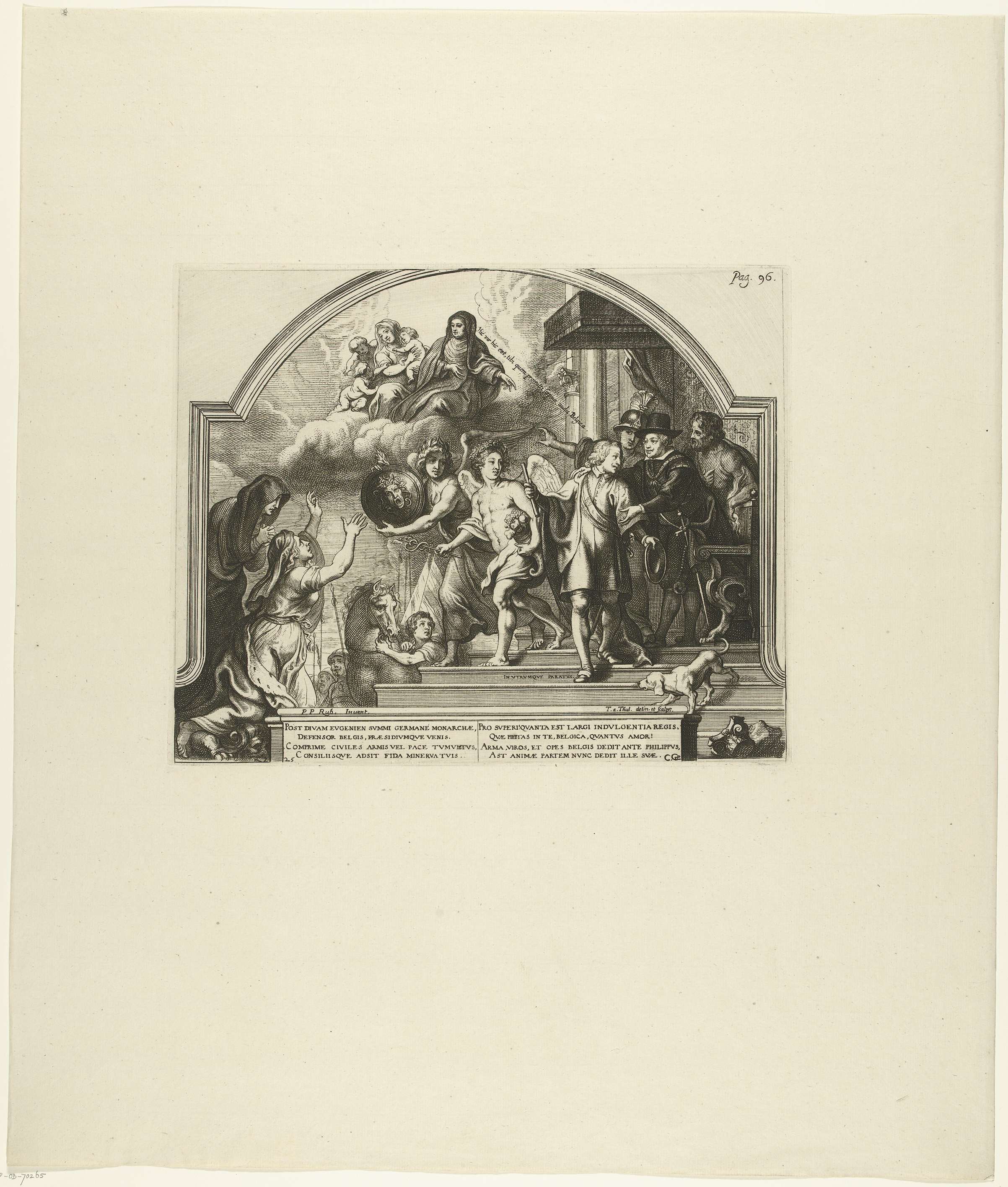 De aanstelling van Ferdinand als gouverneur over de Nederlanden door Filips IV. Links de knielend smekende Nederlandse Maagd, in de hemel Isabella Clara Eugenia. De centrale voorstelling op de triomfboog van Isabella Clara Eugenia opgesteld in de Clarenstraat. Gemerkt rechtsboven: pag. 96. Blad nr. 25 in een geheel van 43 platen die de uitgave van ...