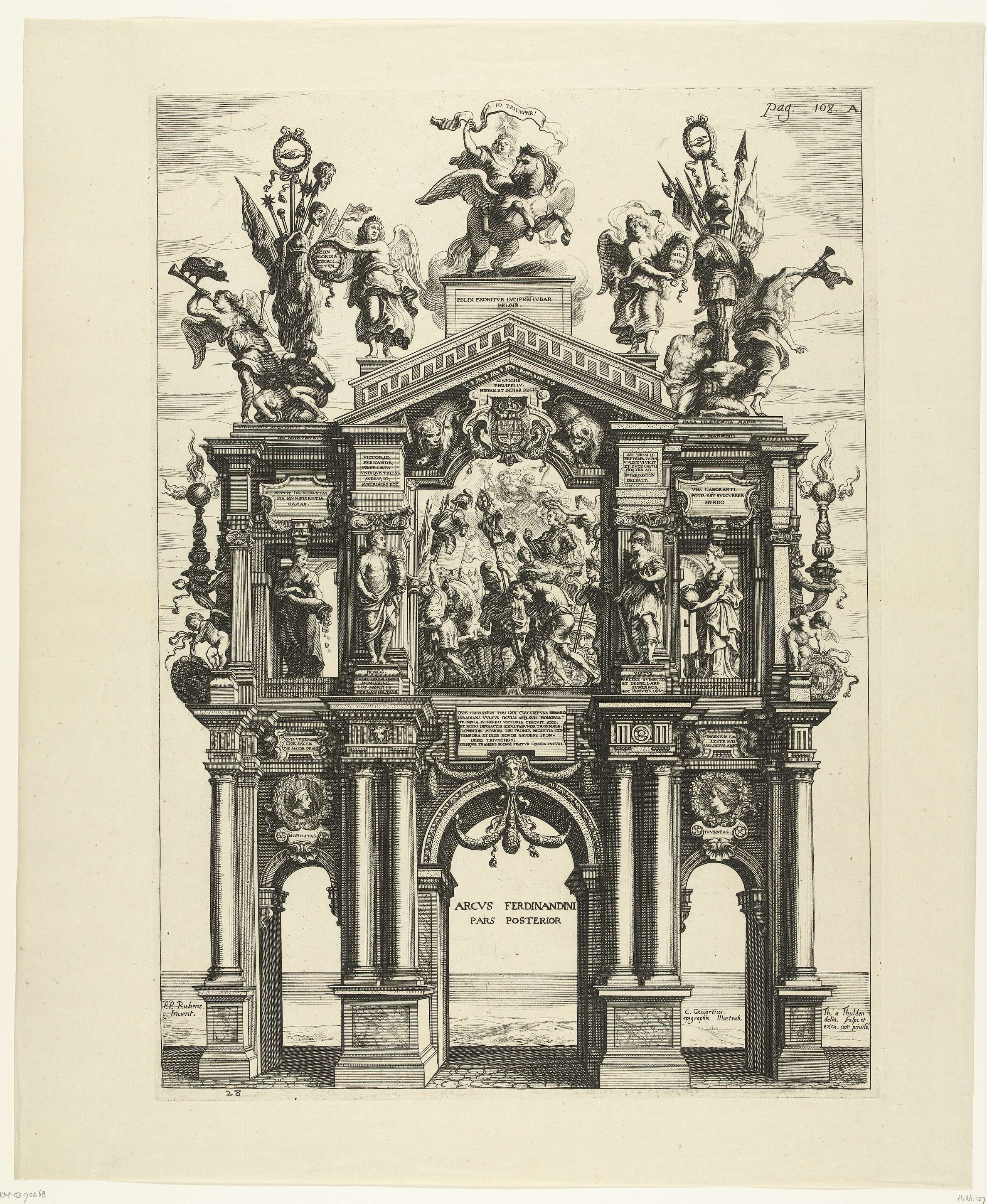 Achterzijde van de triomfboog van Ferdinand opgesteld in de Lange Nieuwstraat. Centraal een voorstelling van de triomf van Ferdinand. Bovenop de poort te paard de Morgenster (Lucifer). Gemerkt rechtsboven: pag. 108A. Blad nr. 28 in een geheel van 43 platen die de uitgave van de beschrijving van de intocht van de Kardinaal Infant Ferdinand van ...