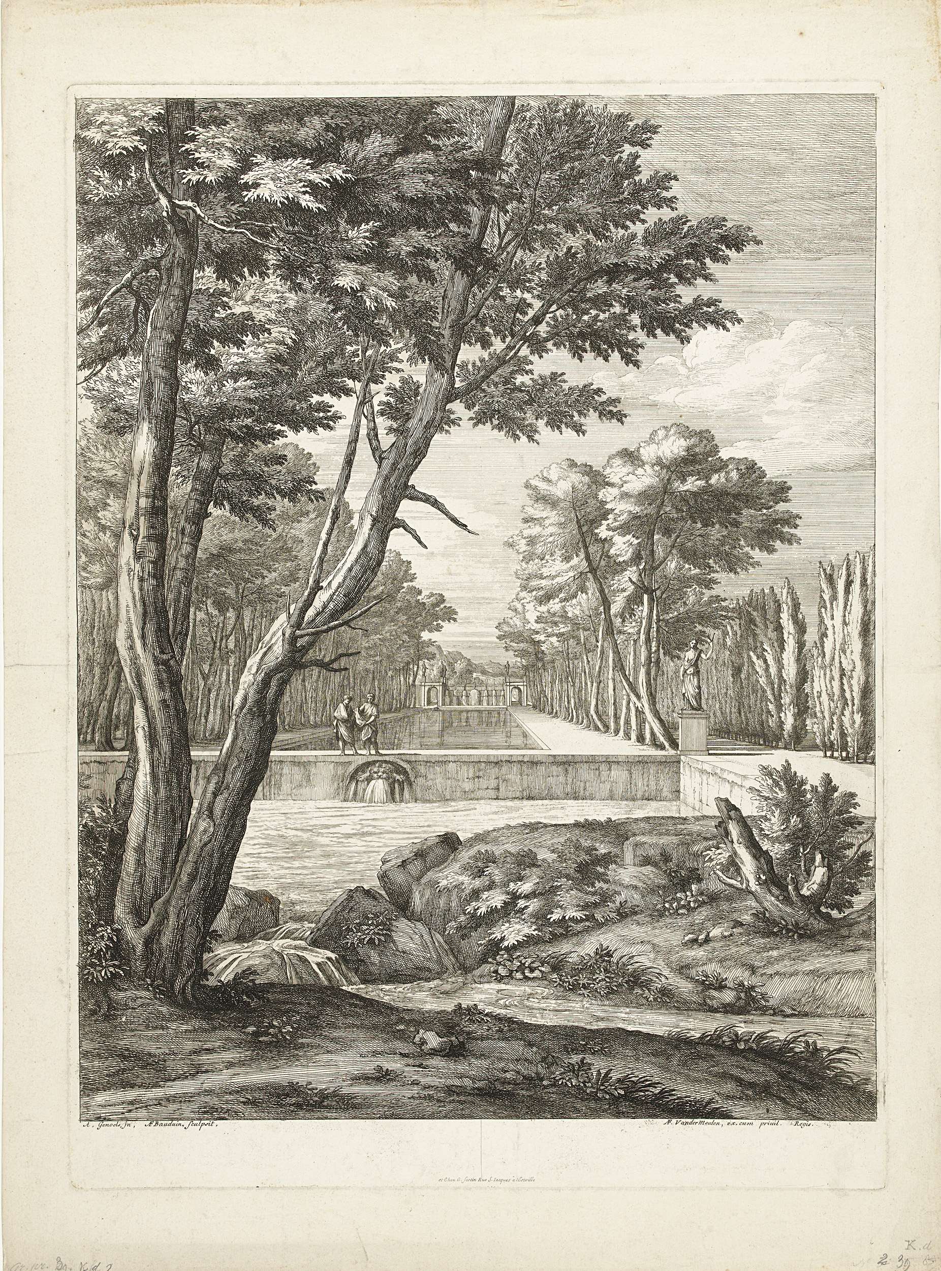 Twee mannen gekleed in Romeinse toga's bij en fontein in een classicistische tuin met waterbassins.