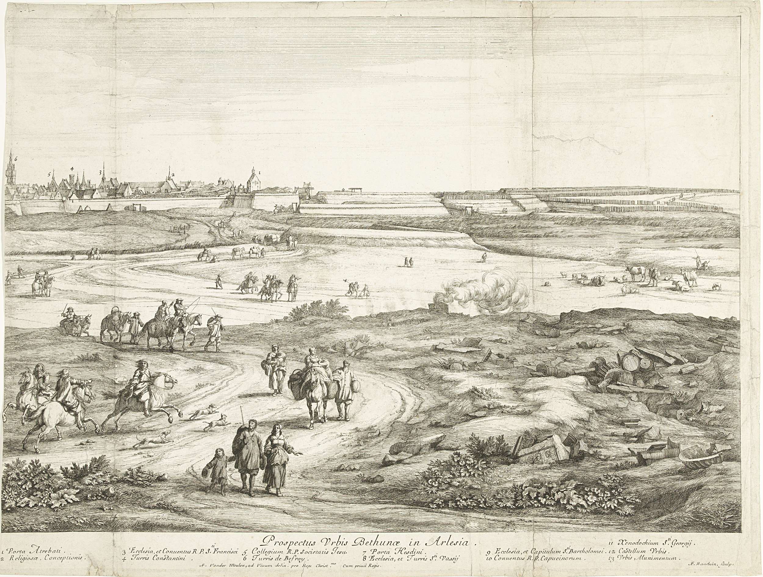 Gezicht op het stadje Bethune, geheel links het belfort. Op de voorgrond reizigers op weg naar de stadspoort. In de berm resten van antieke gebouwen.