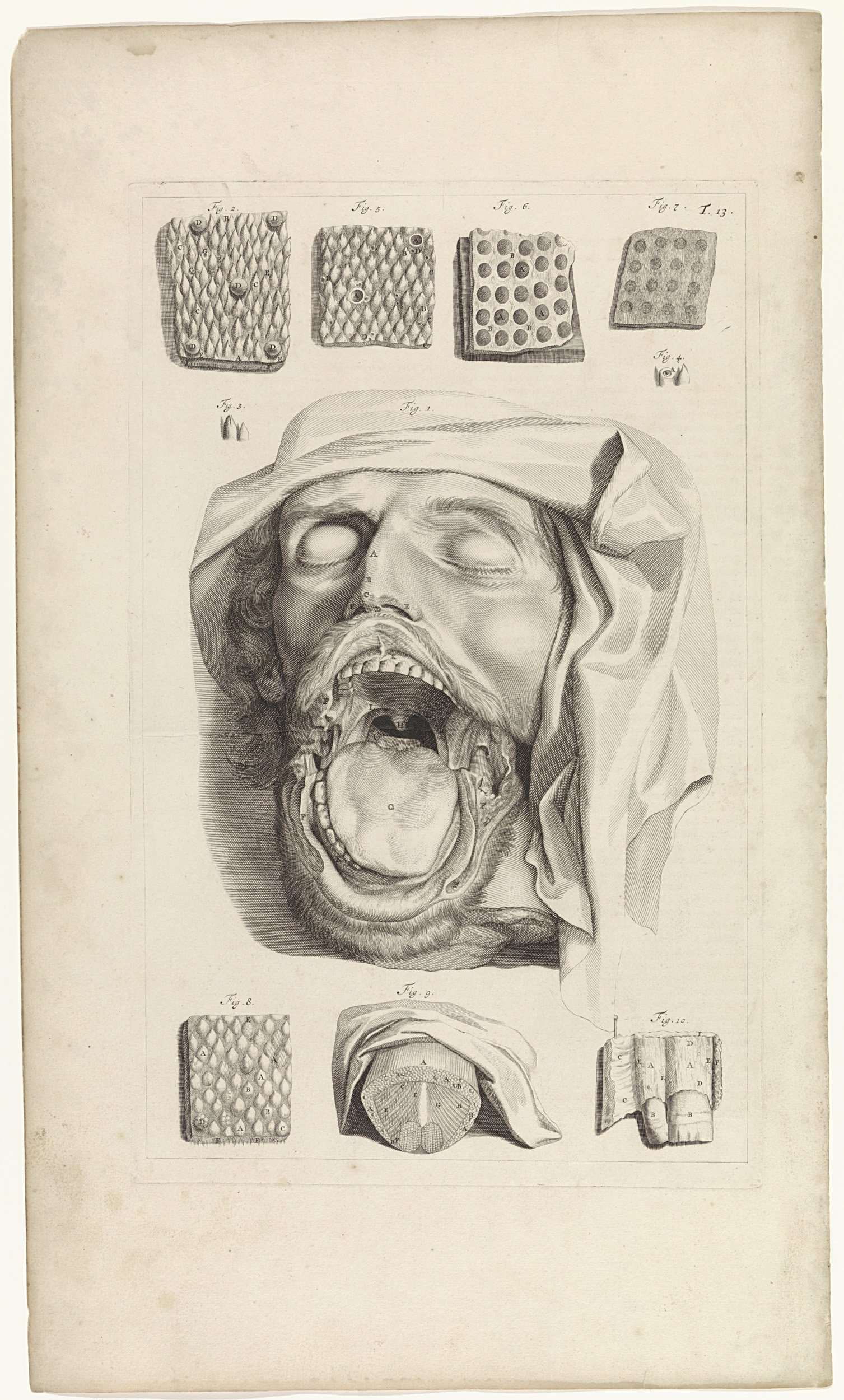 Voorstelling van een hoofd met opengesperde mond. Boven en onder: anatomische studies van de huid van de mond, de neus en de tong. Bovenaan rechts genummerd T. 13.