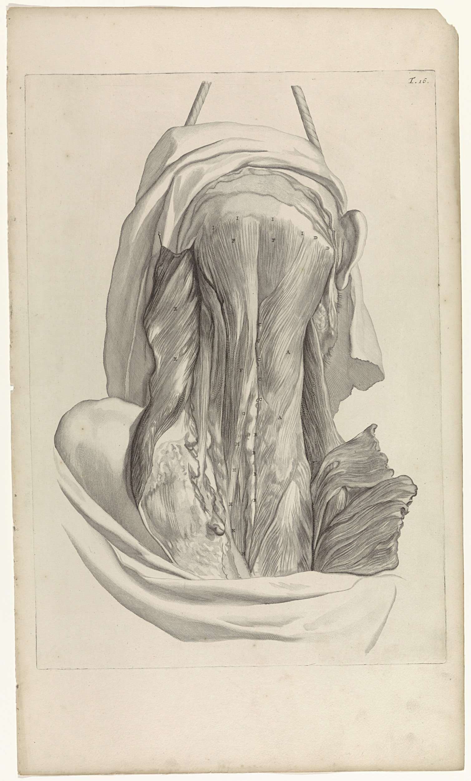 Anatomische studie van de spieren van een achterhoofd en de nek. Bovenaan rechts genummerd T. 16.